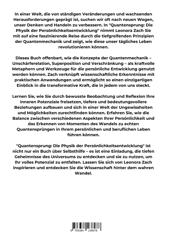 In einer Welt, die von ständigen Veränderungen und wachsenden Herausforderungen geprägt ist, suchen wir oft nach neuen Wegen, unser Denken und Handeln zu verbessern. In "Quantensprung: Die Physik der Persönlichkeitsentwicklung" nimmt Leonora Zach Sie mit auf eine faszinierende Reise durch die tiefgreifenden Prinzipien der Quantenmechanik und zeigt, wie diese unser tägliches Leben revolutionieren können.Dieses Buch offenbart, wie die Konzepte der Quantenmechanik - Unschärferelation, Superposition und Verschränkung - als kraftvolle Metaphern und Werkzeuge für die persönliche Entwicklung genutzt werden können. Zach verknüpft wissenschaftliche Erkenntnisse mit praktischen Anwendungen und ermöglicht so einen einzigartigen Einblick in die transformative Kraft, die in jedem von uns steckt.Lernen Sie, wie Sie durch bewusste Beobachtung und Reflexion Ihre inneren Potenziale freisetzen, tiefere und bedeutungsvollere Beziehungen aufbauen und sich in einer Welt der Ungewissheiten und Möglichkeiten zurechtfinden können. Erfahren Sie, wie die Balance zwischen verschiedenen Aspekten Ihrer Persönlichkeit und das Erkennen von Momenten des Wandels zu echten Quantensprüngen in Ihrem persönlichen und beruflichen Leben führen können."Quantensprung: Die Physik der Persönlichkeitsentwicklung" ist nicht nur ein Buch über Selbsthilfe - es ist eine Einladung, die tiefen Geheimnisse des Universums zu entdecken und sie zu nutzen, um Ihr volles Potenzial zu entfalten. Lassen Sie sich von Leonora Zach inspirieren und entdecken Sie die Wissenschaft hinter dem wahren Wandel.