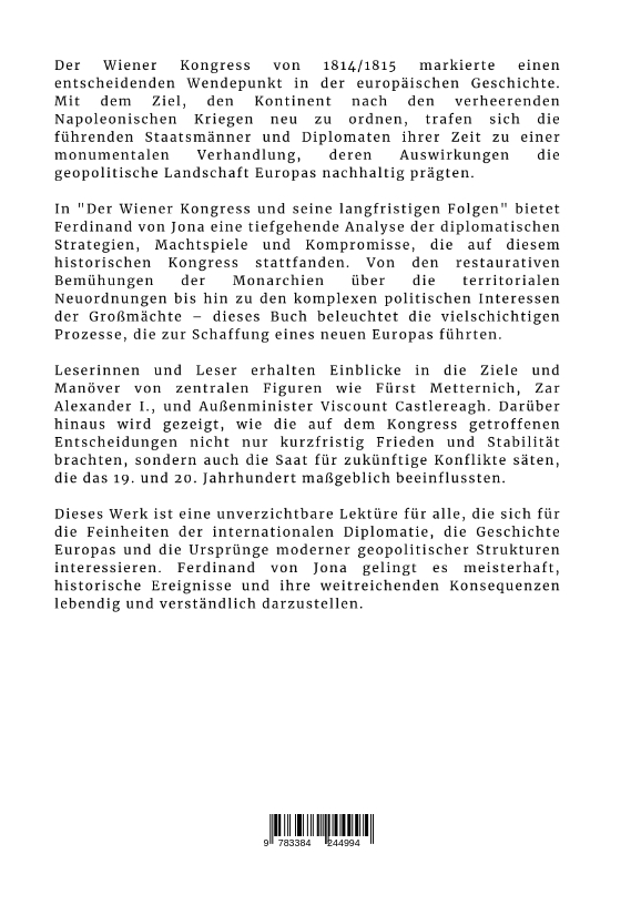 Der Wiener Kongress von 1814/1815 markierte einen entscheidenden Wendepunkt in der europäischen Geschichte. Mit dem Ziel, den Kontinent nach den verheerenden Napoleonischen Kriegen neu zu ordnen, trafen sich die führenden Staatsmänner und Diplomaten ihrer Zeit zu einer monumentalen Verhandlung, deren Auswirkungen die geopolitische Landschaft Europas nachhaltig prägten.In "Der Wiener Kongress und seine langfristigen Folgen" bietet Ferdinand von Jona eine tiefgehende Analyse der diplomatischen Strategien, Machtspiele und Kompromisse, die auf diesem historischen Kongress stattfanden. Von den restaurativen Bemühungen der Monarchien über die territorialen Neuordnungen bis hin zu den komplexen politischen Interessen der Großmächte - dieses Buch beleuchtet die vielschichtigen Prozesse, die zur Schaffung eines neuen Europas führten.Leserinnen und Leser erhalten Einblicke in die Ziele und Manöver von zentralen Figuren wie Fürst Metternich, Zar Alexander I., und Außenminister Viscount Castlereagh. Darüber hinaus wird gezeigt, wie die auf dem Kongress getroffenen Entscheidungen nicht nur kurzfristig Frieden und Stabilität brachten, sondern auch die Saat für zukünftige Konflikte säten, die das 19. und 20. Jahrhundert maßgeblich beeinflussten.Dieses Werk ist eine unverzichtbare Lektüre für alle, die sich für die Feinheiten der internationalen Diplomatie, die Geschichte Europas und die Ursprünge moderner geopolitischer Strukturen interessieren. Ferdinand von Jona gelingt es meisterhaft, historische Ereignisse und ihre weitreichenden Konsequenzen lebendig und verständlich darzustellen.