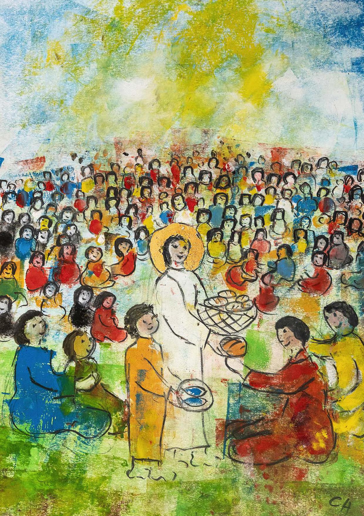 Themen der Bilder: Gemeinsam am Tisch; Mit Zachäus am Tisch; Die wunderbare Brotvermehrung; Das große Gastmahl; Das letzte Abendmahl; die Emmaus-Jünger; Wir feiern Gottesdienst; Tischgemeinschaft auf der ganzen Welt