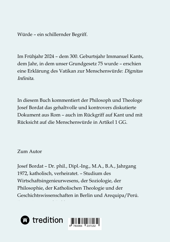 | Schlagworte | Christentum • Dignitas Infinita • Grundgesetz • Immanuel Kant • Kommentar • Menschenwürde • Philosophie • Theologie • Vatikan |