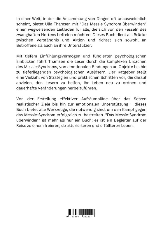 In einer Welt, in der die Ansammlung von Dingen oft unausweichlich scheint, bietet Ulla Thamsen mit "Das Messie-Syndrom überwinden" einen wegweisenden Leitfaden für alle, die sich von den Fesseln des zwanghaften Hortens befreien möchten. Dieses Buch dient als Brücke zwischen Verständnis und Aktion und richtet sich sowohl an Betroffene als auch an ihre Unterstützer.Mit tiefem Einfühlungsvermögen und fundierten psychologischen Einblicken führt Thamsen die Leser durch die komplexen Ursachen des Messie-Syndroms, von emotionalen Bindungen an Objekte bis hin zu tieferliegenden psychologischen Auslösern. Der Ratgeber stellt eine Vielzahl von Strategien und praktischen Schritten vor, die darauf abzielen, den Lesern zu helfen, ihr Leben neu zu ordnen und dauerhafte Veränderungen herbeizuführen.Von der Erstellung effektiver Aufräumpläne über das Setzen realistischer Ziele bis hin zur emotionalen Unterstützung - dieses Buch bietet alle Werkzeuge, die notwendig sind, um den Kampf gegen das Messie-Syndrom erfolgreich zu bestreiten. "Das Messie-Syndrom überwinden" ist mehr als nur ein Buch; es ist ein Begleiter auf der Reise zu einem freieren, strukturierteren und erfüllteren Leben.