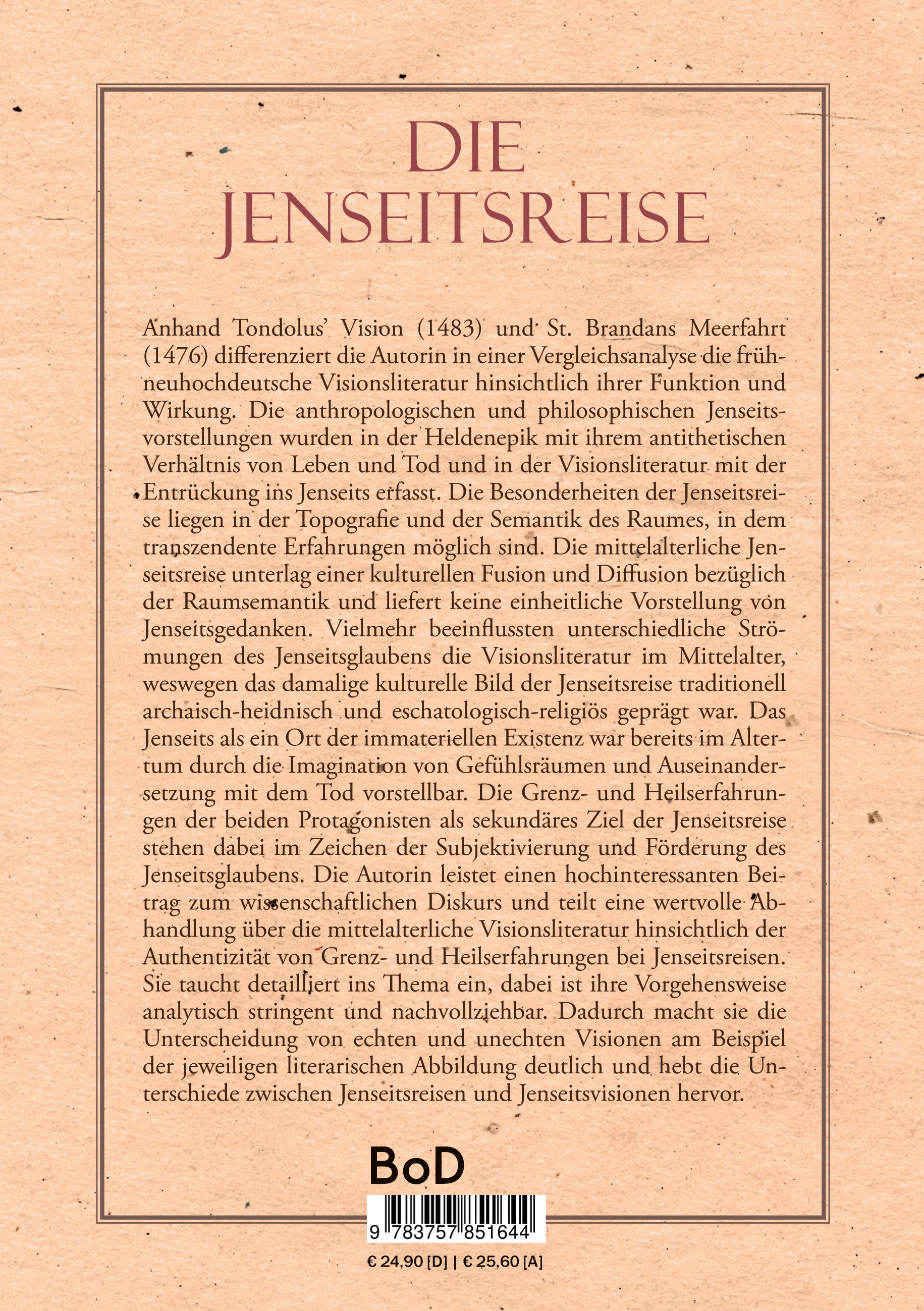 | Schlagworte | Askese • Brendan der Reisende • Ekstase und Charisma • Eschatologische Literatur • Germanistik und Mediävistik • Grenzgänger und Seelenwanderung • Heiligenlegenden Mittelalter • Heilserfahrungen Literatur Mittelalter • Heldenepik Mittelalter • Hochmittelalter deutsche Literatur • Jenseitsglauben Hochmittelalter • Kulturelle Fusion und Diffusion Mittelalter • Leben und Tod in der Literatur • Literaturvergleich mittelalterliche Texte • Literaturwissenschaft Mediävistik • Nahtoderfahrung und religiöse Erfahrung • St. Brandan • Subjektivierung Literatur Mittelalter • Tondolus Vision • Transzendenz in der mittelalterlichen Literatur • Visionsliteratur • Visionsliteratur Mittelalter • visio tnugdali • Wunderberichte Mittelalter |