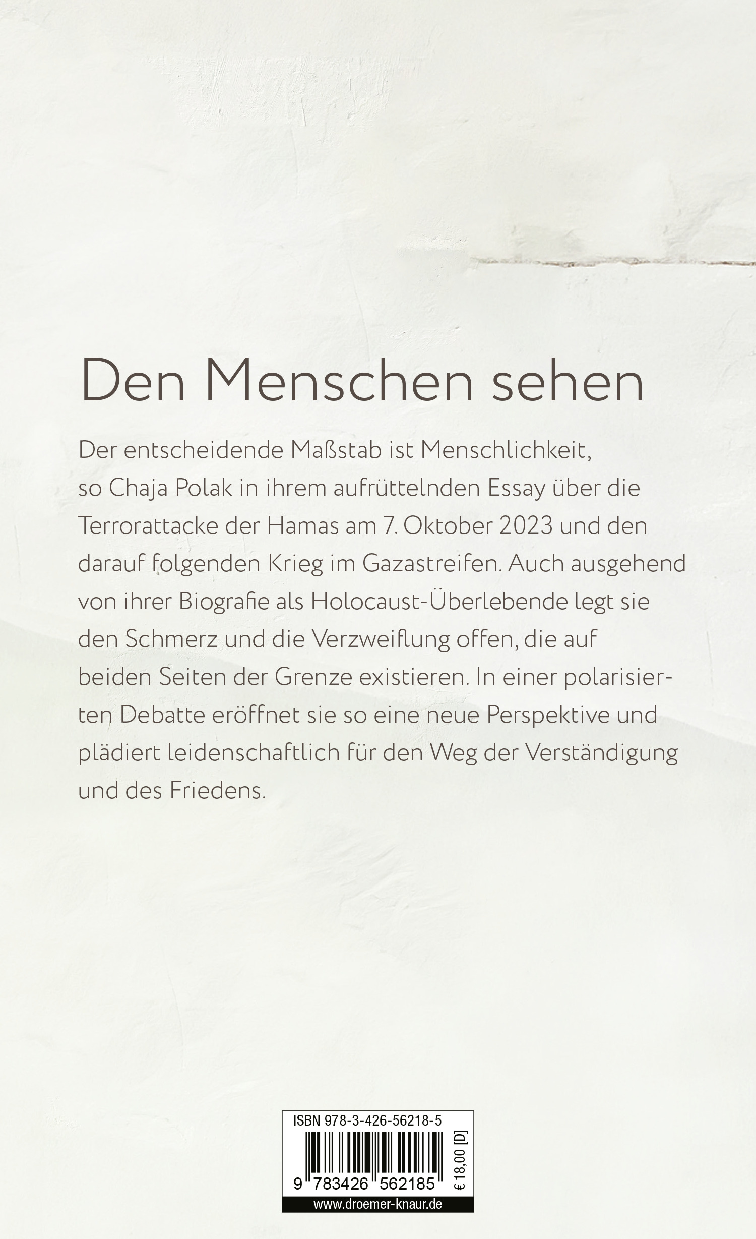 Mit bemerkenswertem Einfühlungsvermögen blickt die 1942 geborene Holocaust-Überlebende Chaja Polak auf die menschlichen Geschichten und Schicksale, die hinter den Schlagzeilen verborgen sind. Sie zeigt uns, dass Trauer und Verzweiflung keine Seiten kennen – und dass wahre Lösungen jenseits von Gewalt gefunden werden müssen.
