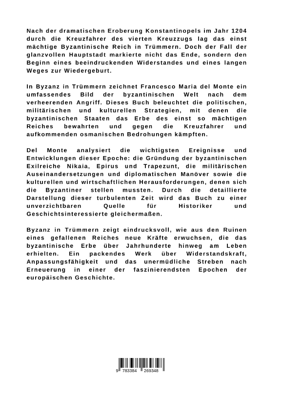 Nach der dramatischen Eroberung Konstantinopels im Jahr 1204 durch die Kreuzfahrer des vierten Kreuzzugs lag das einst mächtige Byzantinische Reich in Trümmern. Doch der Fall der glanzvollen Hauptstadt markierte nicht das Ende, sondern den Beginn eines beeindruckenden Widerstandes und eines langen Weges zur Wiedergeburt.In Byzanz in Trümmern zeichnet Francesco Maria del Monte ein umfassendes Bild der byzantinischen Welt nach dem verheerenden Angriff. Dieses Buch beleuchtet die politischen, militärischen und kulturellen Strategien, mit denen die byzantinischen Staaten das Erbe des einst so mächtigen Reiches bewahrten und gegen die Kreuzfahrer und aufkommenden osmanischen Bedrohungen kämpften.Del Monte analysiert die wichtigsten Ereignisse und Entwicklungen dieser Epoche: die Gründung der byzantinischen Exilreiche Nikaia, Epirus und Trapezunt, die militärischen Auseinandersetzungen und diplomatischen Manöver sowie die kulturellen und wirtschaftlichen Herausforderungen, denen sich die Byzantiner stellen mussten. Durch die detaillierte Darstellung dieser turbulenten Zeit wird das Buch zu einer unverzichtbaren Quelle für Historiker und Geschichtsinteressierte gleichermaßen.Byzanz in Trümmern zeigt eindrucksvoll, wie aus den Ruinen eines gefallenen Reiches neue Kräfte erwuchsen, die das byzantinische Erbe über Jahrhunderte hinweg am Leben erhielten. Ein packendes Werk über Widerstandskraft, Anpassungsfähigkeit und das unermüdliche Streben nach Erneuerung in einer der faszinierendsten Epochen der europäischen Geschichte.