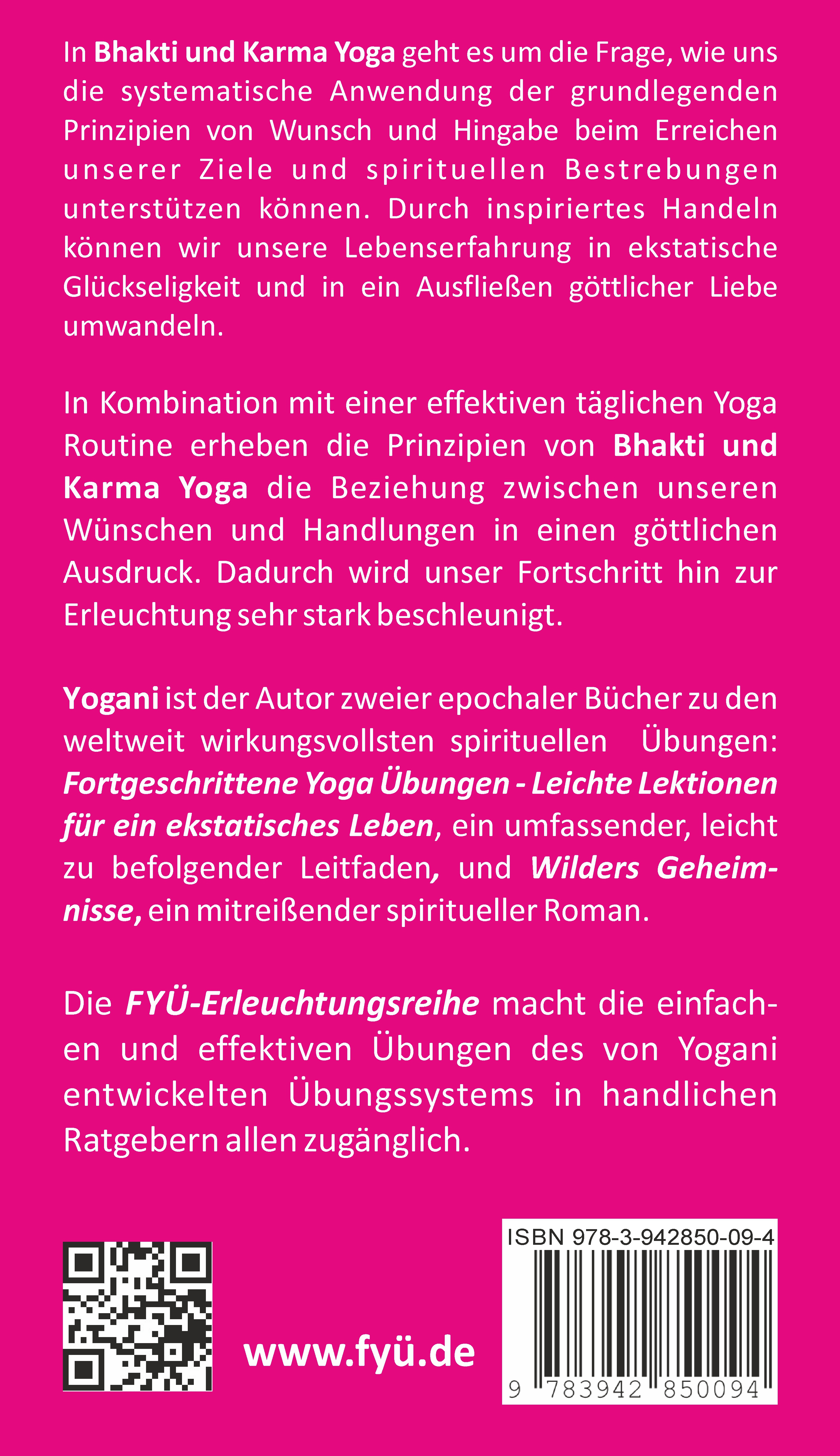 Vorwort zur deutschen Ausgabe 2003 gründete Yogani, ein anonymer fortgeschrittener amerikanischer Yogi, eine Yahoo-Gruppe, in der er ein sehr effektives System yogischer Techniken und teilweise geheimstes yogisches Wissen vorstellte. Unklarheiten klärte er in vielen Fragenbeantwortungen. Der sich daraus entwickelnde, noch nie da gewesene Fundus an Wissen und Ratschlägen sprach Anfänger wie Fortgeschrittene gleichermaßen an und stieß bald weltweit auf große Resonanz. Nach der Übertragung auf eine eigene Website (www.aypsite.org) mit gut besuchtem Forum stellte Yogani das zusammengetragene Wissen systematisch in einzelnen Bänden bereit. Diese werden dem deutschsprachigen Publikum in der FYÜ (Fortgeschrittene Yoga Übungen)-Erleuchtungsreihe zugänglich gemacht. „Bhakti und Karma Yoga – Die Wissenschaft der Hingabe und die Befreiung durch Handeln“ ist die Übersetzung des achten Bandes. Darin wird zunächst das Wesen von Bhakti Yoga erklärt und danach auf verschiedene Methoden eingegangen, wie man Bhakti Yoga für die eigene spirituelle Entwicklung möglichst effektiv einsetzt. Schließlich wird noch eine Brücke zu Karma Yoga geschlagen und erklärt, welche besondere Funktion Karma Yoga im Rahmen der Fortgeschrittenen Yoga Übungen erfüllt. Der Übersetzer