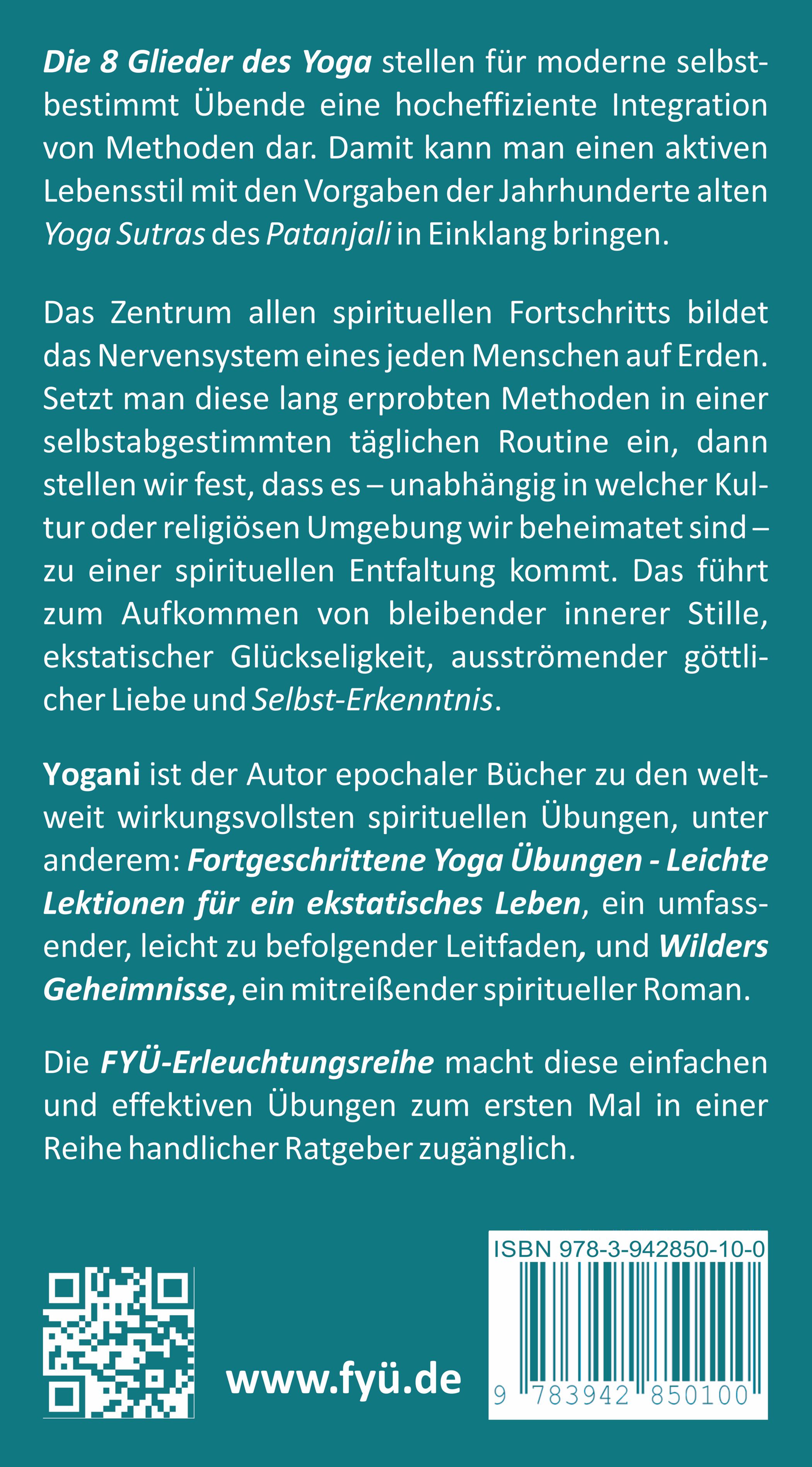 2003 gründete Yogani, ein anonymer fortgeschrittener amerikanischer Yogi, eine Yahoo-Gruppe, in der er ein sehr effektives System yogischer Techniken und teilweise geheimstes yogisches Wissen vorstellte. Unklarheiten klärte er in vielen Fragenbeantwortungen. Der sich daraus entwickelnde, noch nie da gewesene Fundus an Wissen und Ratschlägen sprach Anfänger wie Fortgeschrittene gleichermaßen an und stieß bald weltweit auf große Resonanz. Nach Übertragung auf eine eigene Website (www.aypsite.org) mit gut besuchtem Forum, stellte Yogani das zusammengetragene Wissen systematisch in einzelnen Bänden bereit. Diese werden dem deutschsprachigen Publikum in der FYÜ (Fortgeschrittene Yoga Übungen)-Erleuchtungsreihe zugänglich gemacht. „Die 8 Yoga-Glieder – Struktur und Abstimmung einer selbstbestimmten spirituellen Praxis“ ist die Übersetzung des neunten Bandes. Darin werden auf Grundlage von Patanjalis Yoga-Sutren das Wesen und die Bestandteile des Yoga erläutert. Davon ausgehend erfolgt die Diskussion einer sinnvollen spirituellen Routine und vieler verwandter Themen. Für die zuverlässige und kompetente Hilfe bei der Korrektur bedanke ich mich wieder bei Frau Kerstin Pape. Der Übersetzer