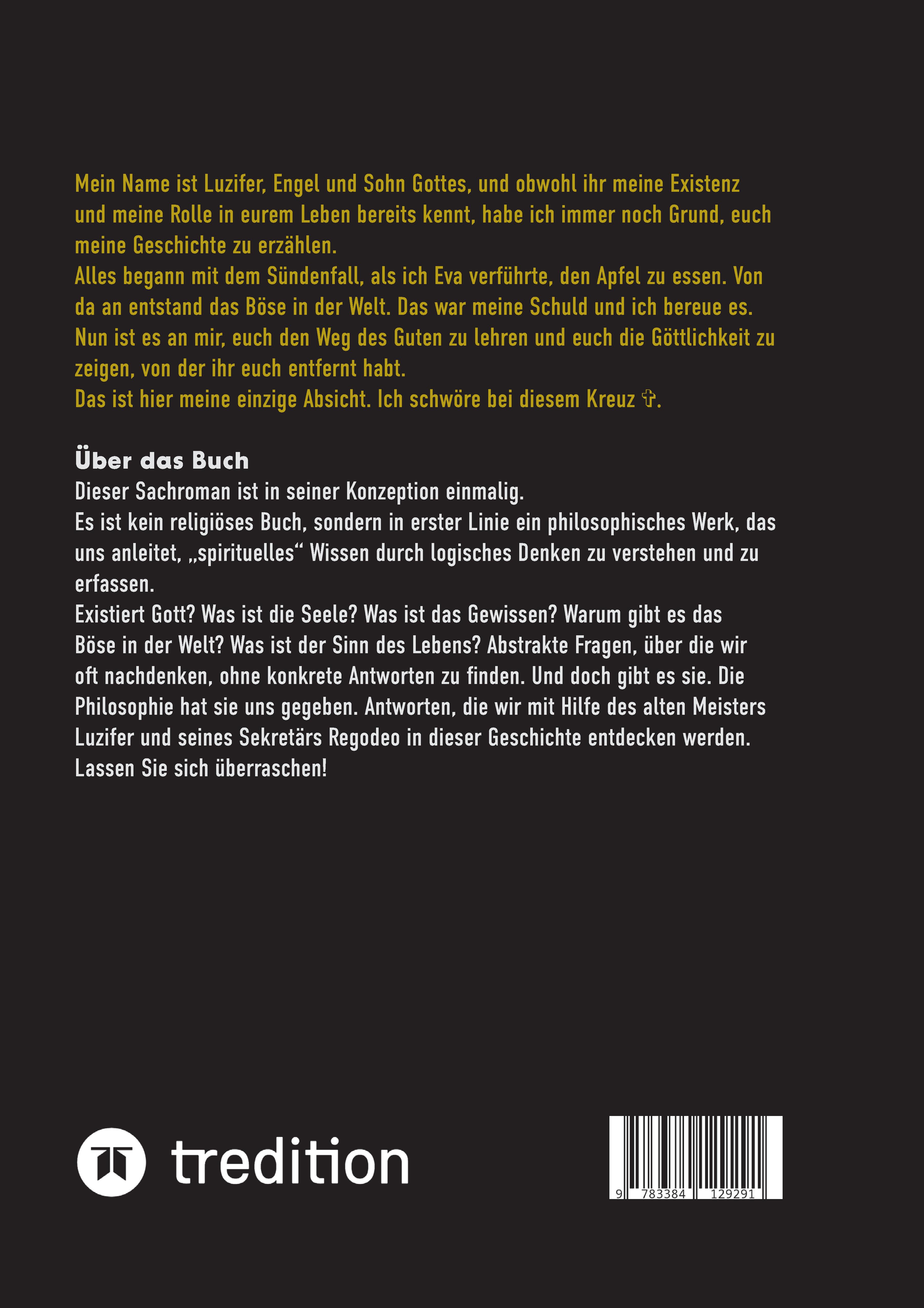 Mein Name ist Luzifer, Engel und Sohn Gottes, und obwohl ihr meine Existenz und meine Rolle in eurem Leben bereits kennt, habe ich immer noch Grund, euch meine Geschichte zu erzählen.Alles begann mit dem Sündenfall, als ich Eva verführte, den Apfel zu essen. Von da an entstand das Böse in der Welt. Das war meine Schuld und ich bereue es. Nun ist es an mir, euch den Weg des Guten zu lehren und euch die Göttlichkeit zu zeigen, von der ihr euch entfernt habt.Das ist hier meine einzige Absicht. Ich schwöre bei diesem Kreuz .