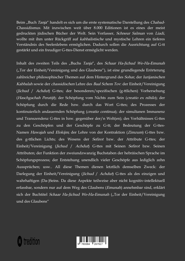 | Schlagworte | Chabad • Chassidismus • Glaube • Judentum • Kabbalah • Schneerson • Schneur Salman • Schöpfung • Sefer Tanya • Sefirot |