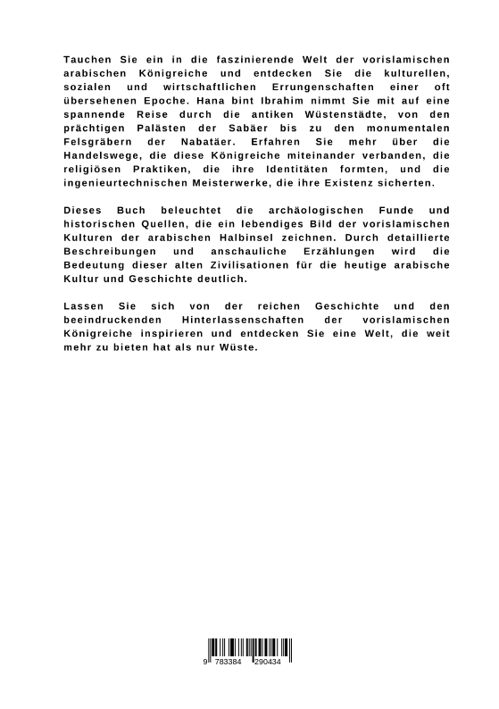 Tauchen Sie ein in die faszinierende Welt der vorislamischen arabischen Königreiche und entdecken Sie die kulturellen, sozialen und wirtschaftlichen Errungenschaften einer oft übersehenen Epoche. Hana bint Ibrahim nimmt Sie mit auf eine spannende Reise durch die antiken Wüstenstädte, von den prächtigen Palästen der Sabäer bis zu den monumentalen Felsgräbern der Nabatäer. Erfahren Sie mehr über die Handelswege, die diese Königreiche miteinander verbanden, die religiösen Praktiken, die ihre Identitäten formten, und die ingenieurtechnischen Meisterwerke, die ihre Existenz sicherten.Dieses Buch beleuchtet die archäologischen Funde und historischen Quellen, die ein lebendiges Bild der vorislamischen Kulturen der arabischen Halbinsel zeichnen. Durch detaillierte Beschreibungen und anschauliche Erzählungen wird die Bedeutung dieser alten Zivilisationen für die heutige arabische Kultur und Geschichte deutlich.Lassen Sie sich von der reichen Geschichte und den beeindruckenden Hinterlassenschaften der vorislamischen Königreiche inspirieren und entdecken Sie eine Welt, die weit mehr zu bieten hat als nur Wüste.