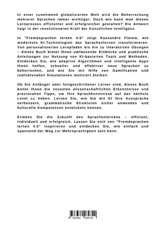 In einer zunehmend globalisierten Welt wird die Beherrschung mehrerer Sprachen immer wichtiger. Doch wie kann man diesen Lernprozess effizienter und erfolgreicher gestalten? Die Antwort liegt in der revolutionären Kraft der Künstlichen Intelligenz.In "Fremdsprachen lernen 4.0" zeigt Kassandra Flotow, wie modernste KI-Technologien das Sprachenlernen transformieren. Von personalisierten Lernpfaden bis hin zu interaktiven Übungen - dieses Buch bietet Ihnen umfassende Einblicke und praktische Anleitungen zur Nutzung von KI-basierten Tools und Methoden. Entdecken Sie, wie adaptive Algorithmen und intelligente Apps Ihnen helfen, schneller und effektiver neue Sprachen zu beherrschen, und wie Sie mit Hilfe von Gamification und realitätsnahen Simulationen motiviert bleiben.Ob Sie Anfänger oder fortgeschrittener Lerner sind, dieses Buch bietet Ihnen die neuesten wissenschaftlichen Erkenntnisse und praxisnahen Tipps, um Ihre Sprachkenntnisse auf das nächste Level zu heben. Lernen Sie, wie Sie mit KI Ihre Aussprache verbessern, grammatische Strukturen sicher anwenden und kulturelle Kompetenzen entwickeln können.Erleben Sie die Zukunft des Sprachenlernens - effizient, individuell und erfolgreich. Lassen Sie sich von "Fremdsprachen lernen 4.0" inspirieren und entdecken Sie, wie einfach und spannend der Weg zur Mehrsprachigkeit sein kann.