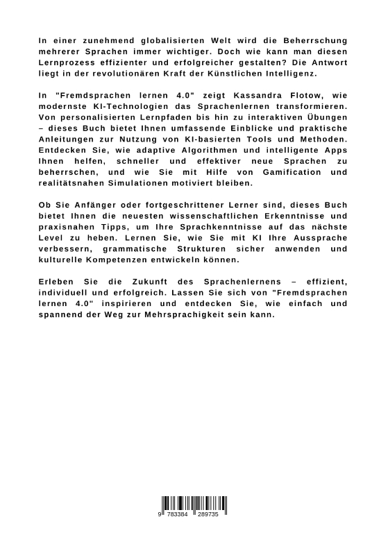 In einer zunehmend globalisierten Welt wird die Beherrschung mehrerer Sprachen immer wichtiger. Doch wie kann man diesen Lernprozess effizienter und erfolgreicher gestalten? Die Antwort liegt in der revolutionären Kraft der Künstlichen Intelligenz.In "Fremdsprachen lernen 4.0" zeigt Kassandra Flotow, wie modernste KI-Technologien das Sprachenlernen transformieren. Von personalisierten Lernpfaden bis hin zu interaktiven Übungen - dieses Buch bietet Ihnen umfassende Einblicke und praktische Anleitungen zur Nutzung von KI-basierten Tools und Methoden. Entdecken Sie, wie adaptive Algorithmen und intelligente Apps Ihnen helfen, schneller und effektiver neue Sprachen zu beherrschen, und wie Sie mit Hilfe von Gamification und realitätsnahen Simulationen motiviert bleiben.Ob Sie Anfänger oder fortgeschrittener Lerner sind, dieses Buch bietet Ihnen die neuesten wissenschaftlichen Erkenntnisse und praxisnahen Tipps, um Ihre Sprachkenntnisse auf das nächste Level zu heben. Lernen Sie, wie Sie mit KI Ihre Aussprache verbessern, grammatische Strukturen sicher anwenden und kulturelle Kompetenzen entwickeln können.Erleben Sie die Zukunft des Sprachenlernens - effizient, individuell und erfolgreich. Lassen Sie sich von "Fremdsprachen lernen 4.0" inspirieren und entdecken Sie, wie einfach und spannend der Weg zur Mehrsprachigkeit sein kann.