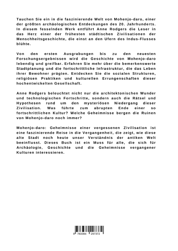 Tauchen Sie ein in die faszinierende Welt von Mohenjo-daro, einer der größten archäologischen Entdeckungen des 20. Jahrhunderts. In diesem fesselnden Werk entführt Anne Rodgers die Leser in das Herz einer der frühesten städtischen Zivilisationen der Menschheitsgeschichte, die einst an den Ufern des Indus-Flusses blühte.Von den ersten Ausgrabungen bis zu den neuesten Forschungsergebnissen wird die Geschichte von Mohenjo-daro lebendig und greifbar. Erfahren Sie mehr über die bemerkenswerte Stadtplanung und die fortschrittliche Infrastruktur, die das Leben ihrer Bewohner prägten. Entdecken Sie die sozialen Strukturen, religiösen Praktiken und kulturellen Errungenschaften dieser hochentwickelten Gesellschaft.Anne Rodgers beleuchtet nicht nur die architektonischen Wunder und technologischen Fortschritte, sondern auch die Rätsel und Hypothesen rund um den mysteriösen Niedergang dieser Zivilisation. Was führte zum abrupten Ende einer so fortschrittlichen Kultur? Welche Geheimnisse bergen die Ruinen von Mohenjo-daro noch immer?Mohenjo-daro: Geheimnisse einer vergessenen Zivilisation ist eine faszinierende Reise in die Vergangenheit, die zeigt, wie diese alte Stadt noch heute unser Verständnis der antiken Welt beeinflusst. Dieses Buch ist ein Muss für alle, die sich für Archäologie, Geschichte und die Geheimnisse vergangener Kulturen interessieren.