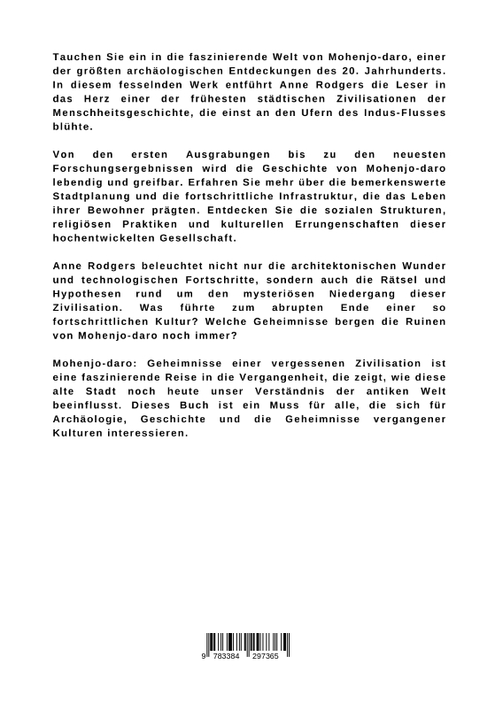 Tauchen Sie ein in die faszinierende Welt von Mohenjo-daro, einer der größten archäologischen Entdeckungen des 20. Jahrhunderts. In diesem fesselnden Werk entführt Anne Rodgers die Leser in das Herz einer der frühesten städtischen Zivilisationen der Menschheitsgeschichte, die einst an den Ufern des Indus-Flusses blühte.Von den ersten Ausgrabungen bis zu den neuesten Forschungsergebnissen wird die Geschichte von Mohenjo-daro lebendig und greifbar. Erfahren Sie mehr über die bemerkenswerte Stadtplanung und die fortschrittliche Infrastruktur, die das Leben ihrer Bewohner prägten. Entdecken Sie die sozialen Strukturen, religiösen Praktiken und kulturellen Errungenschaften dieser hochentwickelten Gesellschaft.Anne Rodgers beleuchtet nicht nur die architektonischen Wunder und technologischen Fortschritte, sondern auch die Rätsel und Hypothesen rund um den mysteriösen Niedergang dieser Zivilisation. Was führte zum abrupten Ende einer so fortschrittlichen Kultur? Welche Geheimnisse bergen die Ruinen von Mohenjo-daro noch immer?Mohenjo-daro: Geheimnisse einer vergessenen Zivilisation ist eine faszinierende Reise in die Vergangenheit, die zeigt, wie diese alte Stadt noch heute unser Verständnis der antiken Welt beeinflusst. Dieses Buch ist ein Muss für alle, die sich für Archäologie, Geschichte und die Geheimnisse vergangener Kulturen interessieren.