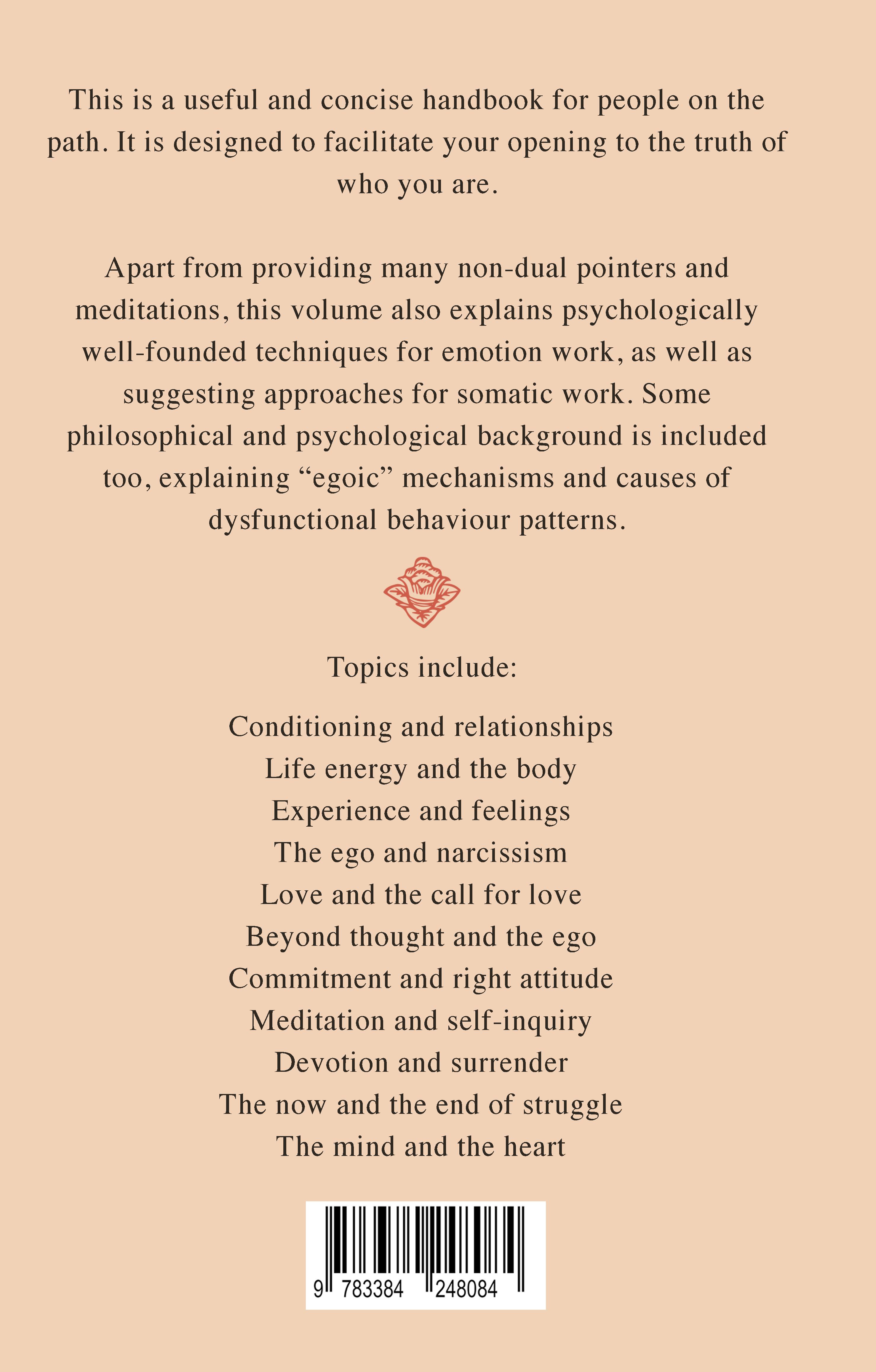 This is a useful and concise handbook for people on the path. It is designed to facilitate your opening to the truth of who you are. Apart from providing many non-dual pointers and meditations, this volume also explains psychologically well-founded techniques for emotion work, as well as suggesting approaches for somatic work. Some philosophical and psychological background is included too, explaining "egoic" mechanisms and causes of dysfunctional behaviour patterns. Topics include: Conditioning and relationships / Life energy and the body / Experience and feelings / The ego and narcissism / Love and the call for love / Beyond thought and the ego / Commitment and right attitude / Meditation and self-inquiry / Devotion and surrender / The now and the end of struggle / The mind and the heart