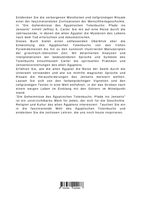 Entdecken Sie die verborgenen Weisheiten und tiefgründigen Rituale einer der faszinierendsten Zivilisationen der Menschheitsgeschichte. In "Die Geheimnisse des Ägyptischen Totenbuchs: Pfade ins Jenseits" nimmt Jeffrey S. Carter Sie mit auf eine Reise durch die Jahrtausende, in denen die alten Ägypter die Mysterien des Lebens nach dem Tod erforschten und dokumentierten.Dieses Buch bietet einen umfassenden Überblick über die Entwicklung des Ägyptischen Totenbuchs von den frühen Pyramidentexten bis hin zu den kunstvoll illustrierten Manuskripten der griechisch-römischen Zeit. Mit detaillierten Analysen und Interpretationen der bedeutendsten Sprüche und Symbole des Totenbuchs entschlüsselt Carter die spirituellen Praktiken und Jenseitsvorstellungen des alten Ägyptens.Erfahren Sie, wie die alten Ägypter die Reise der Seele durch die Unterwelt verstanden und wie sie mithilfe magischer Sprüche und Rituale die Herausforderungen des Jenseits meistern wollten. Lassen Sie sich von den farbenprächtigen Vignetten und den tiefgründigen Texten in eine Welt entführen, in der das Streben nach einem ewigen Leben im Einklang mit den Göttern im Mittelpunkt stand."Die Geheimnisse des Ägyptischen Totenbuchs: Pfade ins Jenseits" ist ein unverzichtbares Werk für jeden, der sich für die Geschichte, Religion und Kultur des alten Ägyptens interessiert. Tauchen Sie ein in die faszinierende Welt des Ägyptischen Totenbuchs und entdecken Sie die zeitlosen Lehren, die uns noch heute inspirieren.