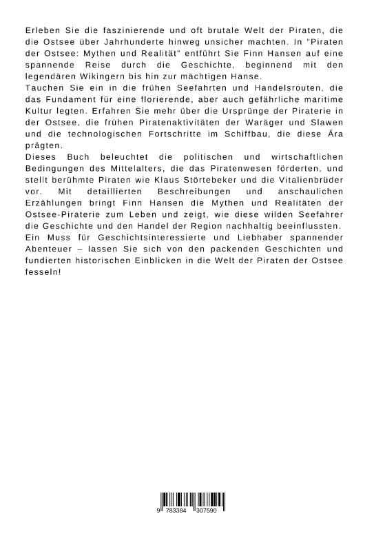 Erleben Sie die faszinierende und oft brutale Welt der Piraten, die die Ostsee über Jahrhunderte hinweg unsicher machten. In "Piraten der Ostsee: Mythen und Realität" entführt Sie Finn Hansen auf eine spannende Reise durch die Geschichte, beginnend mit den legendären Wikingern bis hin zur mächtigen Hanse.Tauchen Sie ein in die frühen Seefahrten und Handelsrouten, die das Fundament für eine florierende, aber auch gefährliche maritime Kultur legten. Erfahren Sie mehr über die Ursprünge der Piraterie in der Ostsee, die frühen Piratenaktivitäten der Waräger und Slawen und die technologischen Fortschritte im Schiffbau, die diese Ära prägten.Dieses Buch beleuchtet die politischen und wirtschaftlichen Bedingungen des Mittelalters, die das Piratenwesen förderten, und stellt berühmte Piraten wie Klaus Störtebeker und die Vitalienbrüder vor. Mit detaillierten Beschreibungen und anschaulichen Erzählungen bringt Finn Hansen die Mythen und Realitäten der Ostsee-Piraterie zum Leben und zeigt, wie diese wilden Seefahrer die Geschichte und den Handel der Region nachhaltig beeinflussten.Ein Muss für Geschichtsinteressierte und Liebhaber spannender Abenteuer - lassen Sie sich von den packenden Geschichten und fundierten historischen Einblicken in die Welt der Piraten der Ostsee fesseln!