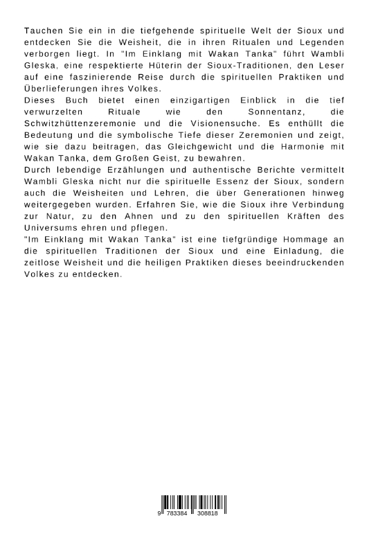 Tauchen Sie ein in die tiefgehende spirituelle Welt der Sioux und entdecken Sie die Weisheit, die in ihren Ritualen und Legenden verborgen liegt. In "Im Einklang mit Wakan Tanka" führt Wambli Gleska, eine respektierte Hüterin der Sioux-Traditionen, den Leser auf eine faszinierende Reise durch die spirituellen Praktiken und Überlieferungen ihres Volkes.Dieses Buch bietet einen einzigartigen Einblick in die tief verwurzelten Rituale wie den Sonnentanz, die Schwitzhüttenzeremonie und die Visionensuche. Es enthüllt die Bedeutung und die symbolische Tiefe dieser Zeremonien und zeigt, wie sie dazu beitragen, das Gleichgewicht und die Harmonie mit Wakan Tanka, dem Großen Geist, zu bewahren.Durch lebendige Erzählungen und authentische Berichte vermittelt Wambli Gleska nicht nur die spirituelle Essenz der Sioux, sondern auch die Weisheiten und Lehren, die über Generationen hinweg weitergegeben wurden. Erfahren Sie, wie die Sioux ihre Verbindung zur Natur, zu den Ahnen und zu den spirituellen Kräften des Universums ehren und pflegen."Im Einklang mit Wakan Tanka" ist eine tiefgründige Hommage an die spirituellen Traditionen der Sioux und eine Einladung, die zeitlose Weisheit und die heiligen Praktiken dieses beeindruckenden Volkes zu entdecken.