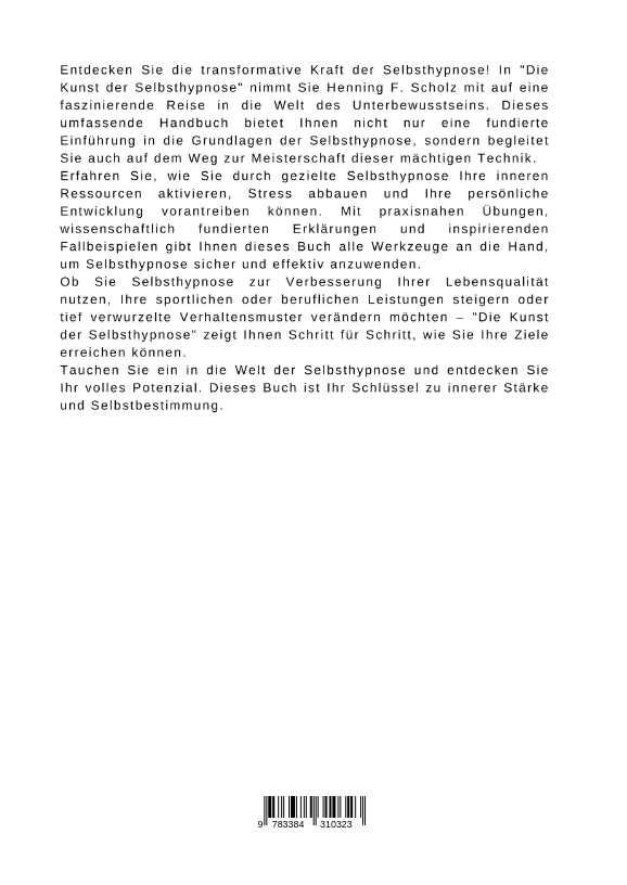 Entdecken Sie die transformative Kraft der Selbsthypnose! In "Die Kunst der Selbsthypnose" nimmt Sie Henning F. Scholz mit auf eine faszinierende Reise in die Welt des Unterbewusstseins. Dieses umfassende Handbuch bietet Ihnen nicht nur eine fundierte Einführung in die Grundlagen der Selbsthypnose, sondern begleitet Sie auch auf dem Weg zur Meisterschaft dieser mächtigen Technik.Erfahren Sie, wie Sie durch gezielte Selbsthypnose Ihre inneren Ressourcen aktivieren, Stress abbauen und Ihre persönliche Entwicklung vorantreiben können. Mit praxisnahen Übungen, wissenschaftlich fundierten Erklärungen und inspirierenden Fallbeispielen gibt Ihnen dieses Buch alle Werkzeuge an die Hand, um Selbsthypnose sicher und effektiv anzuwenden.Ob Sie Selbsthypnose zur Verbesserung Ihrer Lebensqualität nutzen, Ihre sportlichen oder beruflichen Leistungen steigern oder tief verwurzelte Verhaltensmuster verändern möchten - "Die Kunst der Selbsthypnose" zeigt Ihnen Schritt für Schritt, wie Sie Ihre Ziele erreichen können.Tauchen Sie ein in die Welt der Selbsthypnose und entdecken Sie Ihr volles Potenzial. Dieses Buch ist Ihr Schlüssel zu innerer Stärke und Selbstbestimmung.