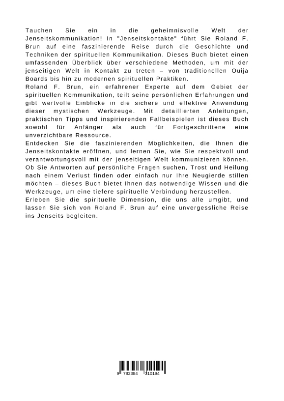 Tauchen Sie ein in die geheimnisvolle Welt der Jenseitskommunikation! In "Jenseitskontakte" führt Sie Roland F. Brun auf eine faszinierende Reise durch die Geschichte und Techniken der spirituellen Kommunikation. Dieses Buch bietet einen umfassenden Überblick über verschiedene Methoden, um mit der jenseitigen Welt in Kontakt zu treten - von traditionellen Ouija Boards bis hin zu modernen spirituellen Praktiken.Roland F. Brun, ein erfahrener Experte auf dem Gebiet der spirituellen Kommunikation, teilt seine persönlichen Erfahrungen und gibt wertvolle Einblicke in die sichere und effektive Anwendung dieser mystischen Werkzeuge. Mit detaillierten Anleitungen, praktischen Tipps und inspirierenden Fallbeispielen ist dieses Buch sowohl für Anfänger als auch für Fortgeschrittene eine unverzichtbare Ressource.Entdecken Sie die faszinierenden Möglichkeiten, die Ihnen die Jenseitskontakte eröffnen, und lernen Sie, wie Sie respektvoll und verantwortungsvoll mit der jenseitigen Welt kommunizieren können. Ob Sie Antworten auf persönliche Fragen suchen, Trost und Heilung nach einem Verlust finden oder einfach nur Ihre Neugierde stillen möchten - dieses Buch bietet Ihnen das notwendige Wissen und die Werkzeuge, um eine tiefere spirituelle Verbindung herzustellen.Erleben Sie die spirituelle Dimension, die uns alle umgibt, und lassen Sie sich von Roland F. Brun auf eine unvergessliche Reise ins Jenseits begleiten.