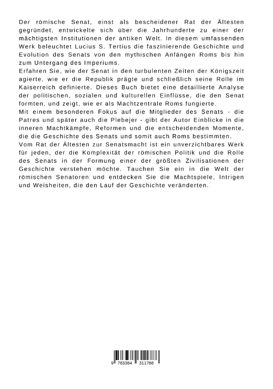 Der römische Senat, einst als bescheidener Rat der Ältesten gegründet, entwickelte sich über die Jahrhunderte zu einer der mächtigsten Institutionen der antiken Welt. In diesem umfassenden Werk beleuchtet Lucius S. Tertius die faszinierende Geschichte und Evolution des Senats von den mythischen Anfängen Roms bis hin zum Untergang des Imperiums.Erfahren Sie, wie der Senat in den turbulenten Zeiten der Königszeit agierte, wie er die Republik prägte und schließlich seine Rolle im Kaiserreich definierte. Dieses Buch bietet eine detaillierte Analyse der politischen, sozialen und kulturellen Einflüsse, die den Senat formten, und zeigt, wie er als Machtzentrale Roms fungierte.Mit einem besonderen Fokus auf die Mitglieder des Senats - die Patres und später auch die Plebejer - gibt der Autor Einblicke in die inneren Machtkämpfe, Reformen und die entscheidenden Momente, die die Geschichte des Senats und somit auch Roms bestimmten.Vom Rat der Ältesten zur Senatsmacht ist ein unverzichtbares Werk für jeden, der die Komplexität der römischen Politik und die Rolle des Senats in der Formung einer der größten Zivilisationen der Geschichte verstehen möchte. Tauchen Sie ein in die Welt der römischen Senatoren und entdecken Sie die Machtspiele, Intrigen und Weisheiten, die den Lauf der Geschichte veränderten.