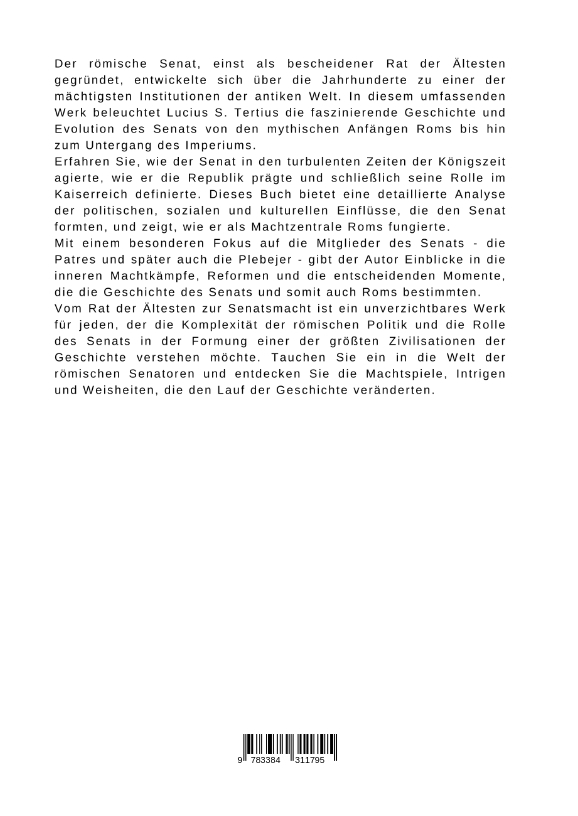 Der römische Senat, einst als bescheidener Rat der Ältesten gegründet, entwickelte sich über die Jahrhunderte zu einer der mächtigsten Institutionen der antiken Welt. In diesem umfassenden Werk beleuchtet Lucius S. Tertius die faszinierende Geschichte und Evolution des Senats von den mythischen Anfängen Roms bis hin zum Untergang des Imperiums.Erfahren Sie, wie der Senat in den turbulenten Zeiten der Königszeit agierte, wie er die Republik prägte und schließlich seine Rolle im Kaiserreich definierte. Dieses Buch bietet eine detaillierte Analyse der politischen, sozialen und kulturellen Einflüsse, die den Senat formten, und zeigt, wie er als Machtzentrale Roms fungierte.Mit einem besonderen Fokus auf die Mitglieder des Senats - die Patres und später auch die Plebejer - gibt der Autor Einblicke in die inneren Machtkämpfe, Reformen und die entscheidenden Momente, die die Geschichte des Senats und somit auch Roms bestimmten.Vom Rat der Ältesten zur Senatsmacht ist ein unverzichtbares Werk für jeden, der die Komplexität der römischen Politik und die Rolle des Senats in der Formung einer der größten Zivilisationen der Geschichte verstehen möchte. Tauchen Sie ein in die Welt der römischen Senatoren und entdecken Sie die Machtspiele, Intrigen und Weisheiten, die den Lauf der Geschichte veränderten.