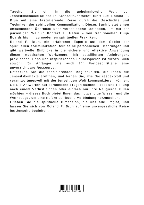 Tauchen Sie ein in die geheimnisvolle Welt der Jenseitskommunikation! In "Jenseitskontakte" führt Sie Roland F. Brun auf eine faszinierende Reise durch die Geschichte und Techniken der spirituellen Kommunikation. Dieses Buch bietet einen umfassenden Überblick über verschiedene Methoden, um mit der jenseitigen Welt in Kontakt zu treten - von traditionellen Ouija Boards bis hin zu modernen spirituellen Praktiken.Roland F. Brun, ein erfahrener Experte auf dem Gebiet der spirituellen Kommunikation, teilt seine persönlichen Erfahrungen und gibt wertvolle Einblicke in die sichere und effektive Anwendung dieser mystischen Werkzeuge. Mit detaillierten Anleitungen, praktischen Tipps und inspirierenden Fallbeispielen ist dieses Buch sowohl für Anfänger als auch für Fortgeschrittene eine unverzichtbare Ressource.Entdecken Sie die faszinierenden Möglichkeiten, die Ihnen die Jenseitskontakte eröffnen, und lernen Sie, wie Sie respektvoll und verantwortungsvoll mit der jenseitigen Welt kommunizieren können. Ob Sie Antworten auf persönliche Fragen suchen, Trost und Heilung nach einem Verlust finden oder einfach nur Ihre Neugierde stillen möchten - dieses Buch bietet Ihnen das notwendige Wissen und die Werkzeuge, um eine tiefere spirituelle Verbindung herzustellen.Erleben Sie die spirituelle Dimension, die uns alle umgibt, und lassen Sie sich von Roland F. Brun auf eine unvergessliche Reise ins Jenseits begleiten.