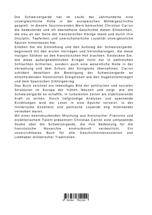Die Schweizergarde hat im Laufe der Jahrhunderte eine unvergleichliche Rolle in der europäischen Militärgeschichte gespielt. In diesem faszinierenden Werk beleuchtet Christian Carron die bedeutende und oft übersehene Geschichte dieser Eliteeinheit, die treu an der Seite der französischen Könige stand und durch ihre Disziplin, Tapferkeit und unerschütterliche Loyalität unvergessliche Spuren hinterlassen hat.Erleben Sie die Entstehung und den Aufstieg der Schweizergarde, beginnend mit den ersten Verträgen und Vereinbarungen, die diese mutigen Söldner an den französischen Hof brachten. Entdecken Sie, wie diese außergewöhnlichen Krieger nicht nur in zahlreichen Schlachten brillierten, sondern auch eine wesentliche Rolle in der Verwaltung und dem Schutz des Königtums übernahmen. Carron schildert detailliert die Beteiligung der Schweizergarde an entscheidenden historischen Ereignissen wie den Hugenottenkriegen und dem Spanischen Erbfolgekrieg.Das Buch zeichnet ein lebendiges Bild der politischen und sozialen Strukturen im Europa der frühen Neuzeit und zeigt, wie die Schweizergarde es schaffte, in turbulenten Zeiten als stabilisierende Kraft zu wirken. Durch tiefgründige Analysen und spannende Erzählungen wird der Leser in eine Epoche versetzt, in der militärische Exzellenz und politische Loyalität eng miteinander verwoben waren.Mit einer beeindruckenden Mischung aus historischer Präzision und erzählerischem Talent präsentiert Christian Carron eine umfassende Studie über die Schweizergarde, die ihre Bedeutung für die französische Monarchie eindrucksvoll verdeutlicht. Ein unverzichtbares Buch für alle Geschichtsinteressierten und Liebhaber militärischer Traditionen.