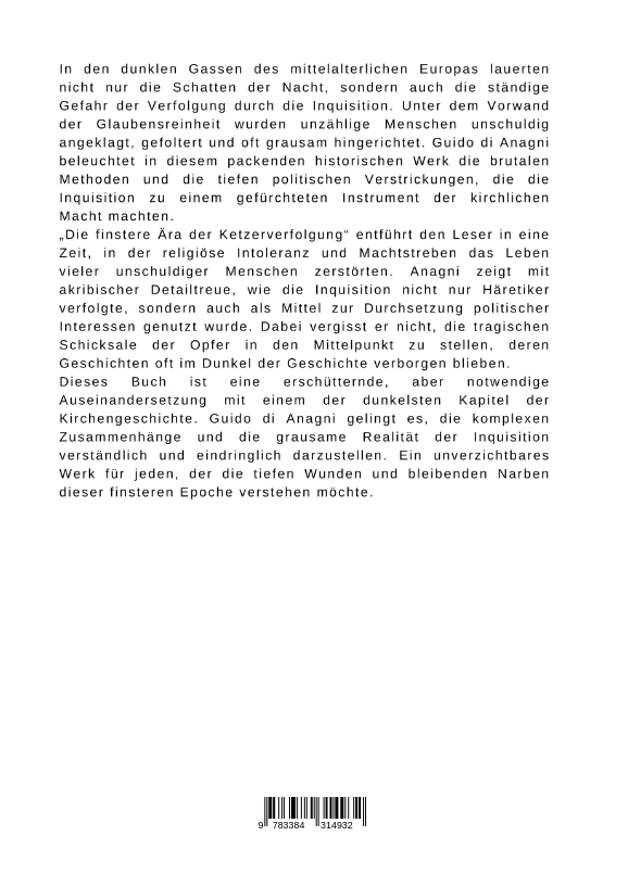 In den dunklen Gassen des mittelalterlichen Europas lauerten nicht nur die Schatten der Nacht, sondern auch die ständige Gefahr der Verfolgung durch die Inquisition. Unter dem Vorwand der Glaubensreinheit wurden unzählige Menschen unschuldig angeklagt, gefoltert und oft grausam hingerichtet. Guido di Anagni beleuchtet in diesem packenden historischen Werk die brutalen Methoden und die tiefen politischen Verstrickungen, die die Inquisition zu einem gefürchteten Instrument der kirchlichen Macht machten."Die finstere Ära der Ketzerverfolgung" entführt den Leser in eine Zeit, in der religiöse Intoleranz und Machtstreben das Leben vieler unschuldiger Menschen zerstörten. Anagni zeigt mit akribischer Detailtreue, wie die Inquisition nicht nur Häretiker verfolgte, sondern auch als Mittel zur Durchsetzung politischer Interessen genutzt wurde. Dabei vergisst er nicht, die tragischen Schicksale der Opfer in den Mittelpunkt zu stellen, deren Geschichten oft im Dunkel der Geschichte verborgen blieben.Dieses Buch ist eine erschütternde, aber notwendige Auseinandersetzung mit einem der dunkelsten Kapitel der Kirchengeschichte. Guido di Anagni gelingt es, die komplexen Zusammenhänge und die grausame Realität der Inquisition verständlich und eindringlich darzustellen. Ein unverzichtbares Werk für jeden, der die tiefen Wunden und bleibenden Narben dieser finsteren Epoche verstehen möchte.
