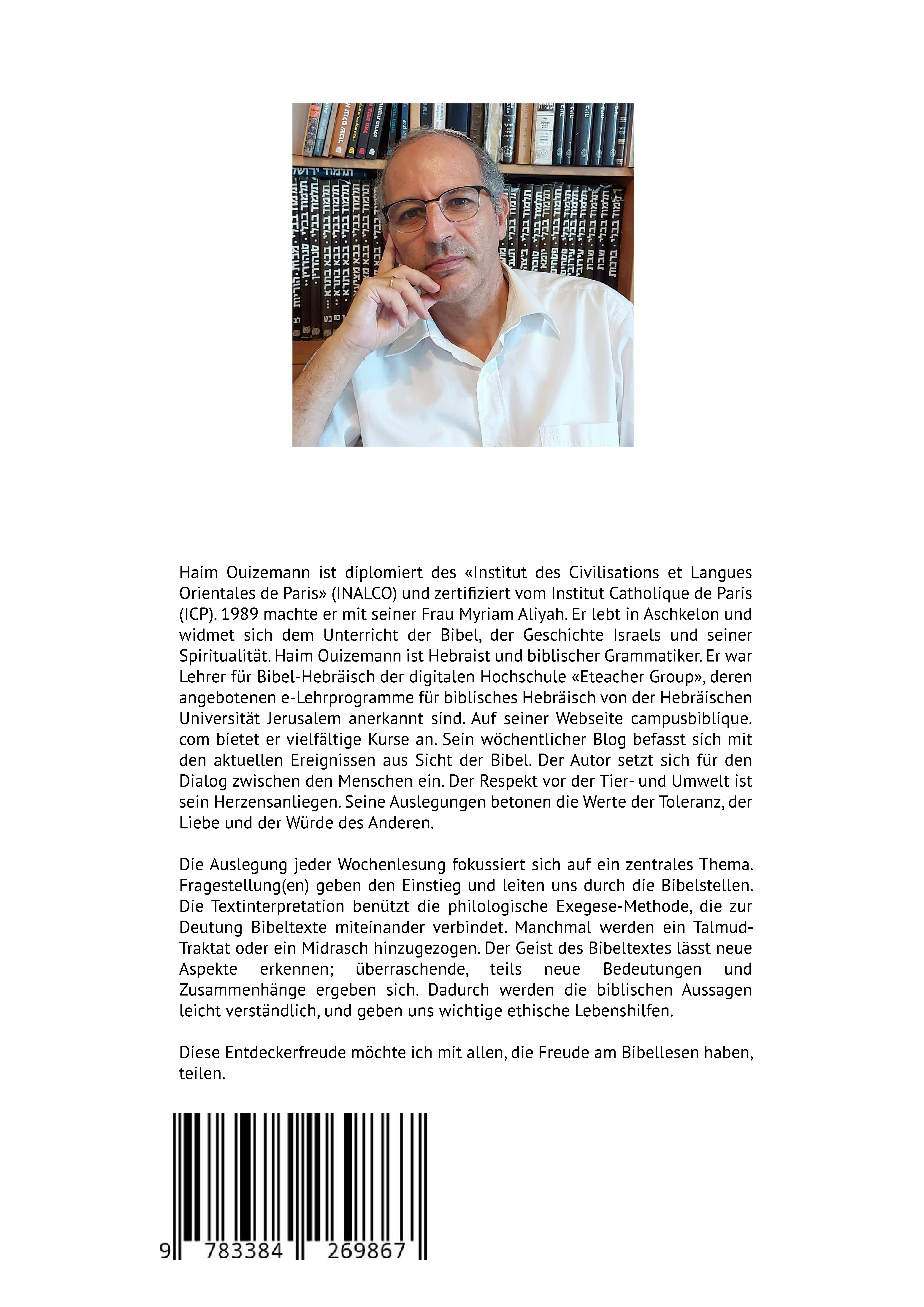 Haïm Ouizemann, geboren 1964, machte 1989 mit seiner Frau Myriam Alija nach Israel. Er besitzt ein Diplom vom Institut des Civilisations et Langues Orientales de Paris (INALCO) und unterrichtet biblisches Hebräisch. Er ist Autor von Büchern und Artikeln über den TaNaKh, die hebräische Bibel. Darüber hinaus haben Haïm und Myriam Ouizemann eine neuartige Methode zum Studium des biblischen Hebräisch entwickelt. Ihr Ziel ist es, jedem zu ermöglichen, den biblischen Text zu entschlüsseln und ihn besser zu verstehen. Zudem unterrichtet Haïm Ouizemann Christen in den hebräischen Quellen, damit sie die hebräischen Wurzeln der Evangelien wiederentdecken und ein besseres Verständnis für sie gewinnen. Haïm Ouizemann tritt für den Dialog zwischen Juden und Christen ein, wobei er ihre Unterschiede respektiert. Dieser Dialog wird durch das gemeinsame Studium der grundlegenden Texte des Volkes Israel, einschliesslich des TaNaKh, ermöglicht. Er trägt einen grossen Teil zum Frieden, Schalom, zwischen den Völkern bei.