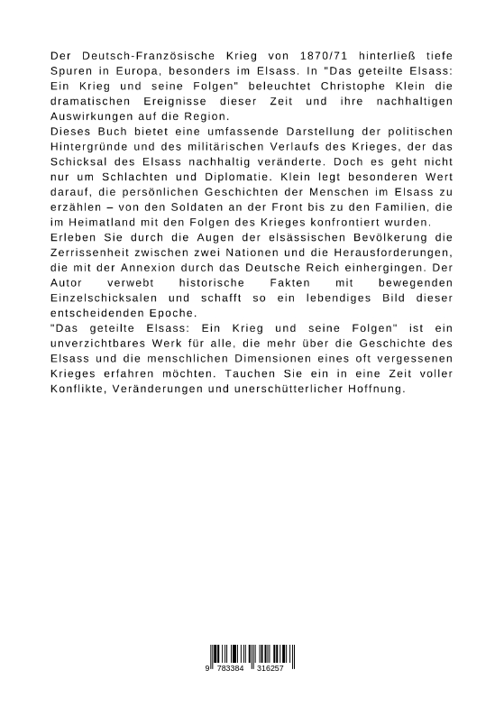 Der Deutsch-Französische Krieg von 1870/71 hinterließ tiefe Spuren in Europa, besonders im Elsass. In "Das geteilte Elsass: Ein Krieg und seine Folgen" beleuchtet Christophe Klein die dramatischen Ereignisse dieser Zeit und ihre nachhaltigen Auswirkungen auf die Region.Dieses Buch bietet eine umfassende Darstellung der politischen Hintergründe und des militärischen Verlaufs des Krieges, der das Schicksal des Elsass nachhaltig veränderte. Doch es geht nicht nur um Schlachten und Diplomatie. Klein legt besonderen Wert darauf, die persönlichen Geschichten der Menschen im Elsass zu erzählen - von den Soldaten an der Front bis zu den Familien, die im Heimatland mit den Folgen des Krieges konfrontiert wurden.Erleben Sie durch die Augen der elsässischen Bevölkerung die Zerrissenheit zwischen zwei Nationen und die Herausforderungen, die mit der Annexion durch das Deutsche Reich einhergingen. Der Autor verwebt historische Fakten mit bewegenden Einzelschicksalen und schafft so ein lebendiges Bild dieser entscheidenden Epoche."Das geteilte Elsass: Ein Krieg und seine Folgen" ist ein unverzichtbares Werk für alle, die mehr über die Geschichte des Elsass und die menschlichen Dimensionen eines oft vergessenen Krieges erfahren möchten. Tauchen Sie ein in eine Zeit voller Konflikte, Veränderungen und unerschütterlicher Hoffnung.