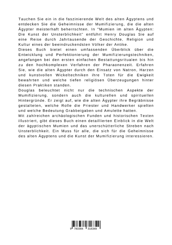 Tauchen Sie ein in die faszinierende Welt des alten Ägyptens und entdecken Sie die Geheimnisse der Mumifizierung, die die alten Ägypter meisterhaft beherrschten. In "Mumien im alten Ägypten: Die Kunst der Unsterblichkeit" entführt Henry Douglas Sie auf eine Reise durch Jahrtausende der Geschichte, Religion und Kultur eines der beeindruckendsten Völker der Antike.Dieses Buch bietet einen umfassenden Überblick über die Entwicklung und Perfektionierung der Mumifizierungstechniken, angefangen bei den ersten einfachen Bestattungsritualen bis hin zu den hochkomplexen Verfahren der Pharaonenzeit. Erfahren Sie, wie die alten Ägypter durch den Einsatz von Natron, Harzen und kunstvollen Wickeltechniken ihre Toten für die Ewigkeit bewahrten und welche tiefen religiösen Überzeugungen hinter diesen Praktiken standen.Douglas beleuchtet nicht nur die technischen Aspekte der Mumifizierung, sondern auch die kulturellen und spirituellen Hintergründe. Er zeigt auf, wie die alten Ägypter ihre Begräbnisse gestalteten, welche Rolle die Priester und Handwerker spielten und welche Bedeutung Grabbeigaben und Amulette hatten.Mit zahlreichen archäologischen Funden und historischen Texten illustriert, gibt dieses Buch einen detaillierten Einblick in die Welt der ägyptischen Mumien und das unerschütterliche Streben nach Unsterblichkeit. Ein Muss für alle, die sich für die Geheimnisse des alten Ägyptens und die Kunst der Mumifizierung interessieren.
