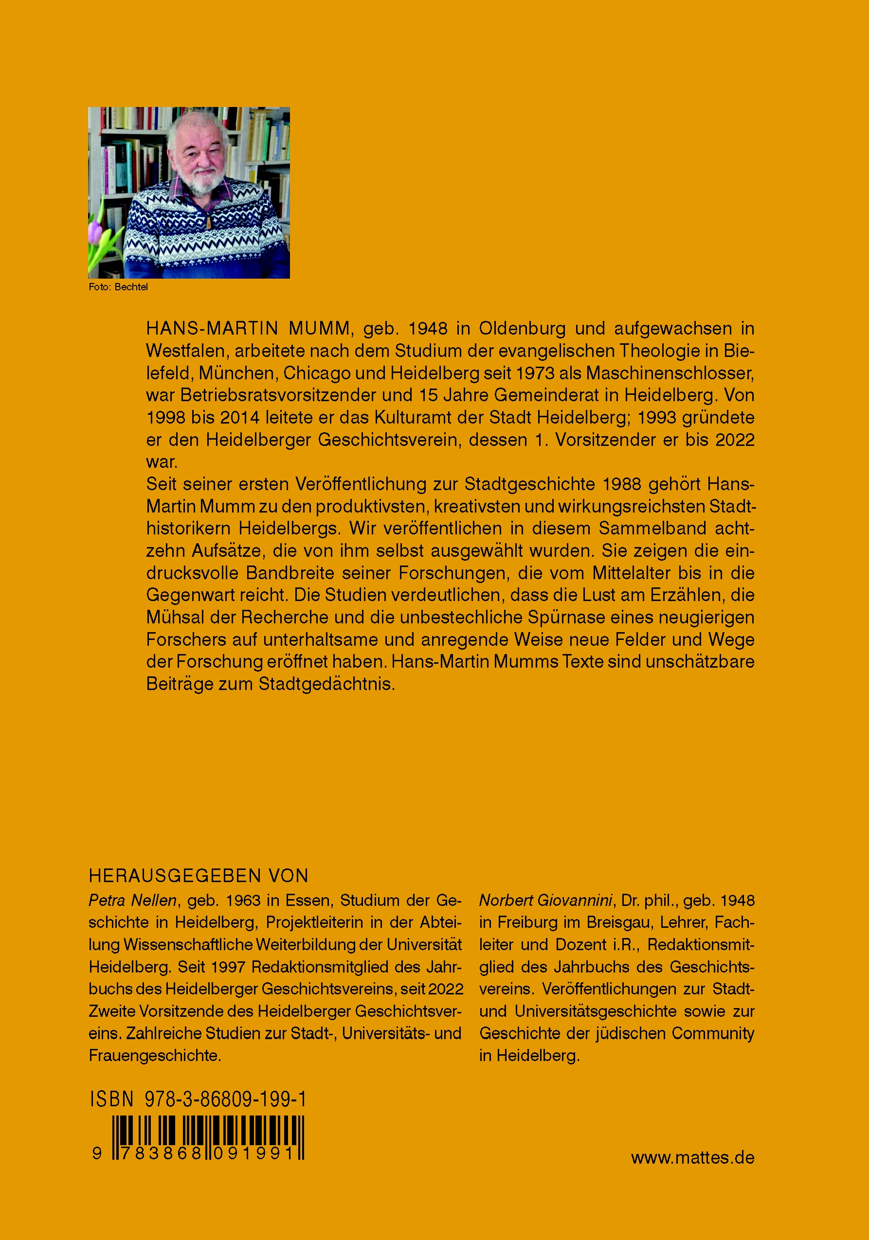 Seit seiner ersten Veröffentlichung zur Stadtgeschichte 1988 gehört Hans-Martin Mumm zu den produktivsten, kreativsten und wirkungsreichsten Stadthistorikern Heidelbergs. Wir veröffentlichen in diesem Sammelband achtzehn Aufsätze, die von ihm selbst ausgewählt wurden. Sie zeigen die eindrucksvolle Bandbreite seiner Forschungen, die vom Mittelalter bis in die Gegenwart reicht. Die Studien verdeutlichen, dass die Lust am Erzählen, die Mühsal der Recherche und die unbestechliche Spürnase eines neugierigen Forschers auf unterhaltsame und anregende Weise neue Felder und Wege der Forschung eröffnet haben. Hans-Martin Mumms Texte sind unschätzbare Beiträge zum Stadtgedächtnis.
