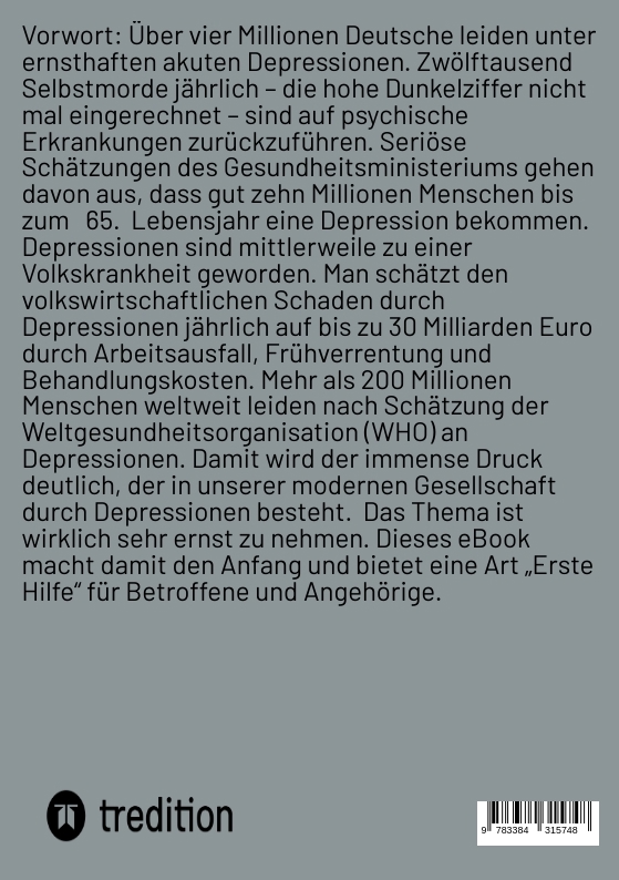 Vorwort Über vier Millionen Deutsche leiden unter ernsthaften akuten Depressionen. Zwölftausend Selbstmorde jährlich - die hohe Dunkelziffer nicht mal eingerechnet - sind auf psychische Erkrankungen zurückzuführen. Seriöse Schätzungen des Gesundheitsministeriums gehen davon aus, dass gut zehn Millionen Menschen bis zum 65. Lebensjahr eine Depression bekommen. Depressionen sind mittlerweile zu einer Volkskrankheit geworden. Man schätzt den volkswirtschaftlichen Schaden durch Depressionen jährlich auf bis zu 30 Milliarden Euro durch Arbeitsausfall, Frühverrentung und Behandlungskosten. Mehr als 200 Millionen Menschen weltweit leiden nach Schätzung der Weltgesundheitsorganisation (WHO) an Depressionen. Damit wird der immense Druck deutlich, der in unserer modernen Gesellschaft durch Depressionen besteht. Das Thema ist wirklich sehr ernst zu nehmen. Dieses Buch macht damit den Anfang und bietet eine Art "Erste Hilfe" für Betroffene und Angehörige.