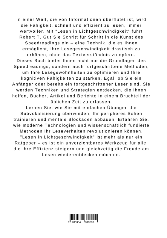 In einer Welt, die von Informationen überflutet ist, wird die Fähigkeit, schnell und effizient zu lesen, immer wertvoller. Mit "Lesen in Lichtgeschwindigkeit" führt Robert T. Gut Sie Schritt für Schritt in die Kunst des Speedreadings ein - eine Technik, die es Ihnen ermöglicht, Ihre Lesegeschwindigkeit drastisch zu erhöhen, ohne das Textverständnis zu opfern.Dieses Buch bietet Ihnen nicht nur die Grundlagen des Speedreadings, sondern auch fortgeschrittene Methoden, um Ihre Lesegewohnheiten zu optimieren und Ihre kognitiven Fähigkeiten zu stärken. Egal, ob Sie ein Anfänger oder bereits ein fortgeschrittener Leser sind, Sie werden Techniken und Strategien entdecken, die Ihnen helfen, Bücher, Artikel und Berichte in einem Bruchteil der üblichen Zeit zu erfassen.Lernen Sie, wie Sie mit einfachen Übungen die Subvokalisierung überwinden, Ihr peripheres Sehen trainieren und mentale Blockaden abbauen. Erfahren Sie, wie moderne Technologien und wissenschaftlich fundierte Methoden Ihr Leseverhalten revolutionieren können."Lesen in Lichtgeschwindigkeit" ist mehr als nur ein Ratgeber - es ist ein unverzichtbares Werkzeug für alle, die ihre Effizienz steigern und gleichzeitig die Freude am Lesen wiederentdecken möchten.