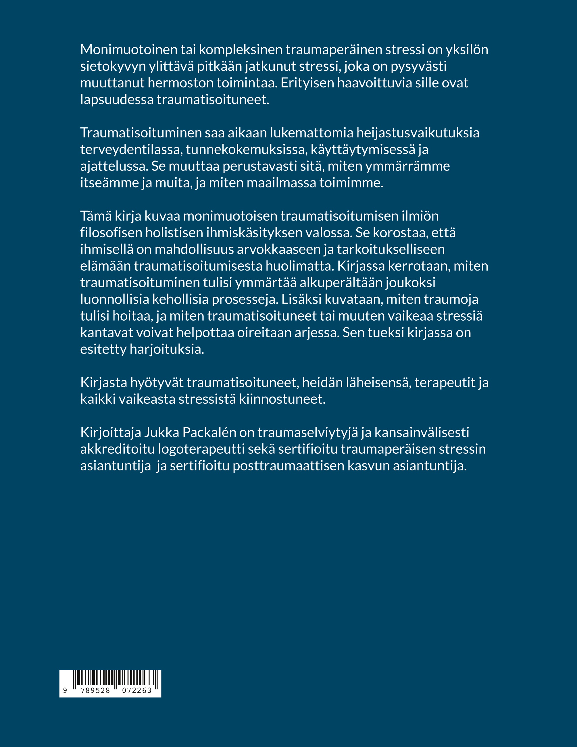 Kirjoittaja Jukka Packalén on traumaselviytyjä ja kansainvälisesti akkreditoitu logoterapeutti, sekä sertifioitu traumaperäisen stressin ja sertifioitu posttraumaattisen kasvun asiantuntija.