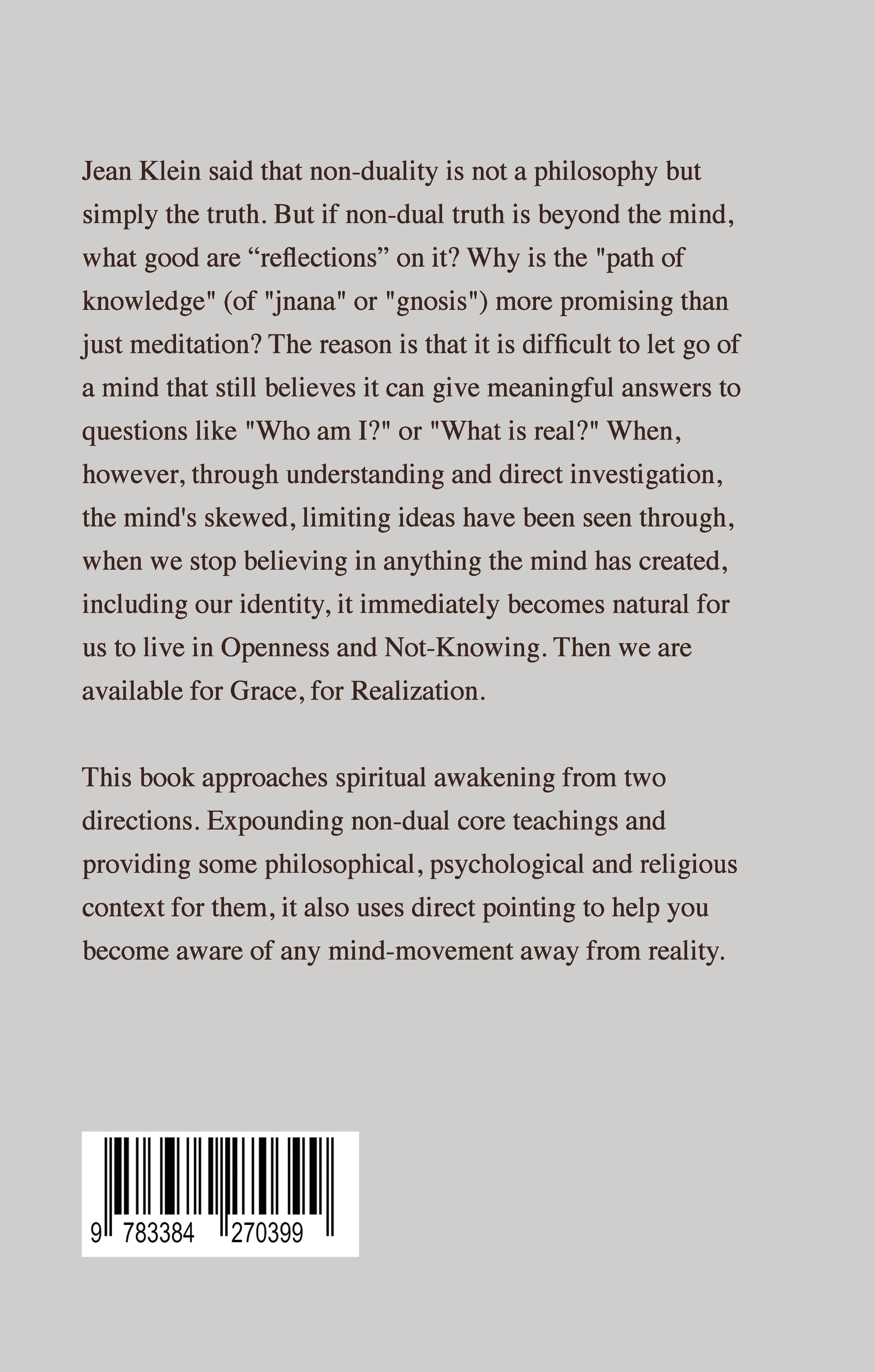 What is special about this book?Jean Klein said that non-duality is not a philosophy but simply the truth. But if non-dual truth is beyond the mind, what good are "reflections" on it? Why is the "path of knowledge" (of "jnana" or "gnosis") more promising than just meditation?The reason is that it is difficult to let go of a mind that still believes it can give meaningful answers to questions like "Who am I?" or "What is real?" When, however, through understanding and direct investigation, the mind's skewed, limiting ideas have been seen through, when we stop believing in anything the mind has created, including our identity, it immediately becomes natural for us to live in Openness and Not-Knowing. Then we are available for Grace, for Realization.This book approaches spiritual awakening from two directions. Expounding non-dual core teachings and providing some philosophical, psychological and religious context for them, it also uses direct pointing to help you become aware of any mind-movement away from reality.Overview of contents: Part 1 is designed to help you enter a state of natural meditation, using non-dual pointers and answering basic questions about ego identity, reality and the nature of thought. Part 2 discusses psychological and emotional aspects of spiritual awakening. Part 3 provides some helpful philosophical context for non-duality. Part 4 relates non-dual teachings to near-death experiences, religion and mysticism.