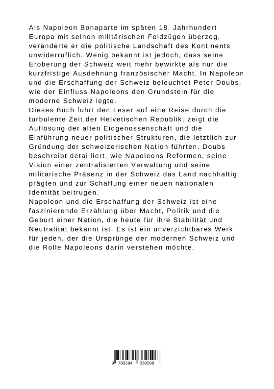 Als Napoleon Bonaparte im späten 18. Jahrhundert Europa mit seinen militärischen Feldzügen überzog, veränderte er die politische Landschaft des Kontinents unwiderruflich. Wenig bekannt ist jedoch, dass seine Eroberung der Schweiz weit mehr bewirkte als nur die kurzfristige Ausdehnung französischer Macht. In Napoleon und die Erschaffung der Schweiz beleuchtet Peter Doubs, wie der Einfluss Napoleons den Grundstein für die moderne Schweiz legte.Dieses Buch führt den Leser auf eine Reise durch die turbulente Zeit der Helvetischen Republik, zeigt die Auflösung der alten Eidgenossenschaft und die Einführung neuer politischer Strukturen, die letztlich zur Gründung der schweizerischen Nation führten. Doubs beschreibt detailliert, wie Napoleons Reformen, seine Vision einer zentralisierten Verwaltung und seine militärische Präsenz in der Schweiz das Land nachhaltig prägten und zur Schaffung einer neuen nationalen Identität beitrugen.Napoleon und die Erschaffung der Schweiz ist eine faszinierende Erzählung über Macht, Politik und die Geburt einer Nation, die heute für ihre Stabilität und Neutralität bekannt ist. Es ist ein unverzichtbares Werk für jeden, der die Ursprünge der modernen Schweiz und die Rolle Napoleons darin verstehen möchte.