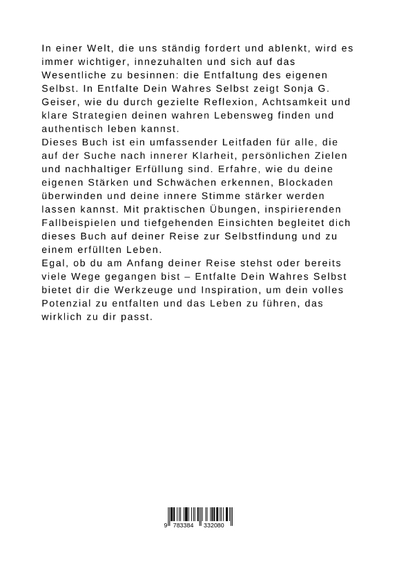 In einer Welt, die uns ständig fordert und ablenkt, wird es immer wichtiger, innezuhalten und sich auf das Wesentliche zu besinnen: die Entfaltung des eigenen Selbst. In Entfalte Dein Wahres Selbst zeigt Sonja G. Geiser, wie du durch gezielte Reflexion, Achtsamkeit und klare Strategien deinen wahren Lebensweg finden und authentisch leben kannst.Dieses Buch ist ein umfassender Leitfaden für alle, die auf der Suche nach innerer Klarheit, persönlichen Zielen und nachhaltiger Erfüllung sind. Erfahre, wie du deine eigenen Stärken und Schwächen erkennen, Blockaden überwinden und deine innere Stimme stärker werden lassen kannst. Mit praktischen Übungen, inspirierenden Fallbeispielen und tiefgehenden Einsichten begleitet dich dieses Buch auf deiner Reise zur Selbstfindung und zu einem erfüllten Leben.Egal, ob du am Anfang deiner Reise stehst oder bereits viele Wege gegangen bist - Entfalte Dein Wahres Selbst bietet dir die Werkzeuge und Inspiration, um dein volles Potenzial zu entfalten und das Leben zu führen, das wirklich zu dir passt.