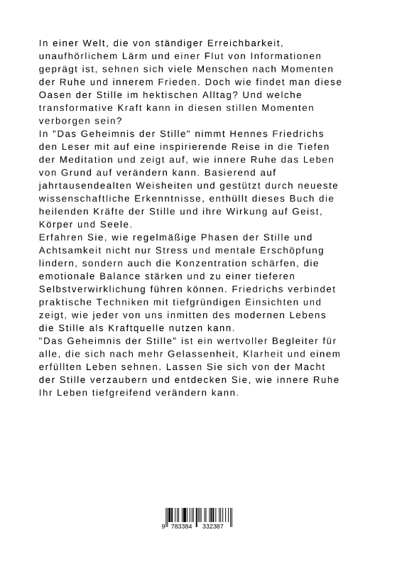 In einer Welt, die von ständiger Erreichbarkeit, unaufhörlichem Lärm und einer Flut von Informationen geprägt ist, sehnen sich viele Menschen nach Momenten der Ruhe und innerem Frieden. Doch wie findet man diese Oasen der Stille im hektischen Alltag? Und welche transformative Kraft kann in diesen stillen Momenten verborgen sein?In "Das Geheimnis der Stille" nimmt Hennes Friedrichs den Leser mit auf eine inspirierende Reise in die Tiefen der Meditation und zeigt auf, wie innere Ruhe das Leben von Grund auf verändern kann. Basierend auf jahrtausendealten Weisheiten und gestützt durch neueste wissenschaftliche Erkenntnisse, enthüllt dieses Buch die heilenden Kräfte der Stille und ihre Wirkung auf Geist, Körper und Seele.Erfahren Sie, wie regelmäßige Phasen der Stille und Achtsamkeit nicht nur Stress und mentale Erschöpfung lindern, sondern auch die Konzentration schärfen, die emotionale Balance stärken und zu einer tieferen Selbstverwirklichung führen können. Friedrichs verbindet praktische Techniken mit tiefgründigen Einsichten und zeigt, wie jeder von uns inmitten des modernen Lebens die Stille als Kraftquelle nutzen kann."Das Geheimnis der Stille" ist ein wertvoller Begleiter für alle, die sich nach mehr Gelassenheit, Klarheit und einem erfüllten Leben sehnen. Lassen Sie sich von der Macht der Stille verzaubern und entdecken Sie, wie innere Ruhe Ihr Leben tiefgreifend verändern kann.