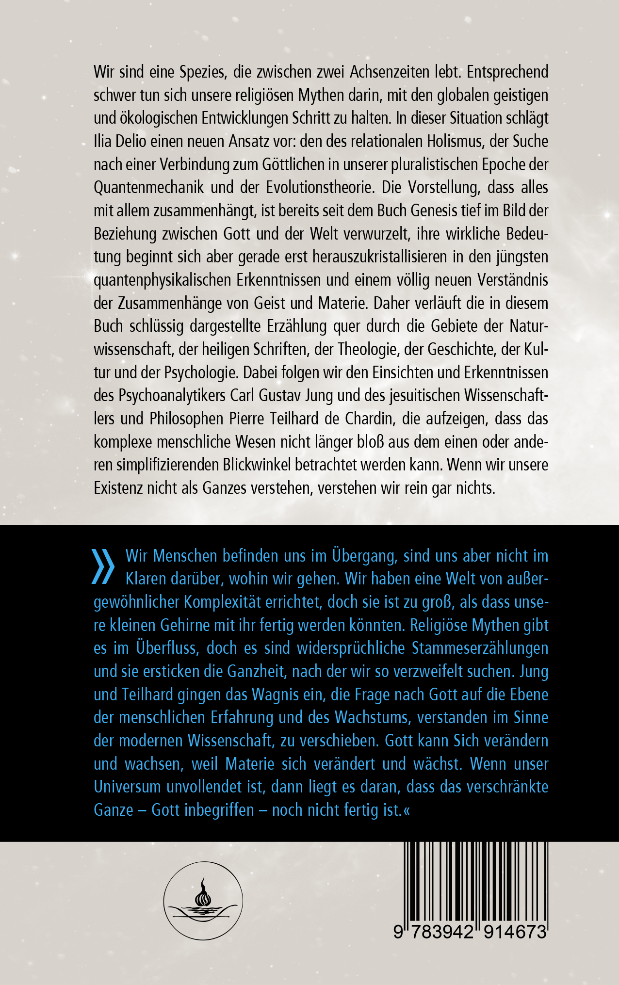 »Wir Menschen befinden uns im Übergang, sind uns aber nicht im Klaren darüber, wohin wir gehen. Wir haben eine Welt von außergewöhnlicher Komplexität errichtet, doch sie ist zu groß, als dass unsere kleinen Gehirne mit ihr fertig werden könnten. Religiöse Mythen gibt es im Überfluss, doch es sind widersprüchliche Stammeserzählungen und sie ersticken die Ganzheit, nach der wir so verzweifelt suchen. Jung und Teilhard gingen das Wagnis ein, die Frage nach Gott auf die Ebene der menschlichen Erfahrung und des Wachstums, verstanden im Sinne der modernen Wissenschaft, zu verschieben. Gott kann Sich verändern und wachsen, weil Materie sich verändert und wächst. Wenn unser Universum unvollendet ist, dann liegt es daran, dass das verschränkte Ganze – Gott inbegriffen – noch nicht fertig ist.«