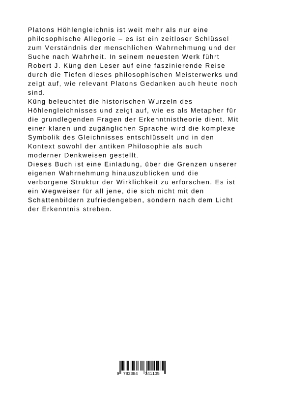 Platons Höhlengleichnis ist weit mehr als nur eine philosophische Allegorie - es ist ein zeitloser Schlüssel zum Verständnis der menschlichen Wahrnehmung und der Suche nach Wahrheit. In seinem neuesten Werk führt Robert J. Küng den Leser auf eine faszinierende Reise durch die Tiefen dieses philosophischen Meisterwerks und zeigt auf, wie relevant Platons Gedanken auch heute noch sind.Küng beleuchtet die historischen Wurzeln des Höhlengleichnisses und zeigt auf, wie es als Metapher für die grundlegenden Fragen der Erkenntnistheorie dient. Mit einer klaren und zugänglichen Sprache wird die komplexe Symbolik des Gleichnisses entschlüsselt und in den Kontext sowohl der antiken Philosophie als auch moderner Denkweisen gestellt.Dieses Buch ist eine Einladung, über die Grenzen unserer eigenen Wahrnehmung hinauszublicken und die verborgene Struktur der Wirklichkeit zu erforschen. Es ist ein Wegweiser für all jene, die sich nicht mit den Schattenbildern zufriedengeben, sondern nach dem Licht der Erkenntnis streben.