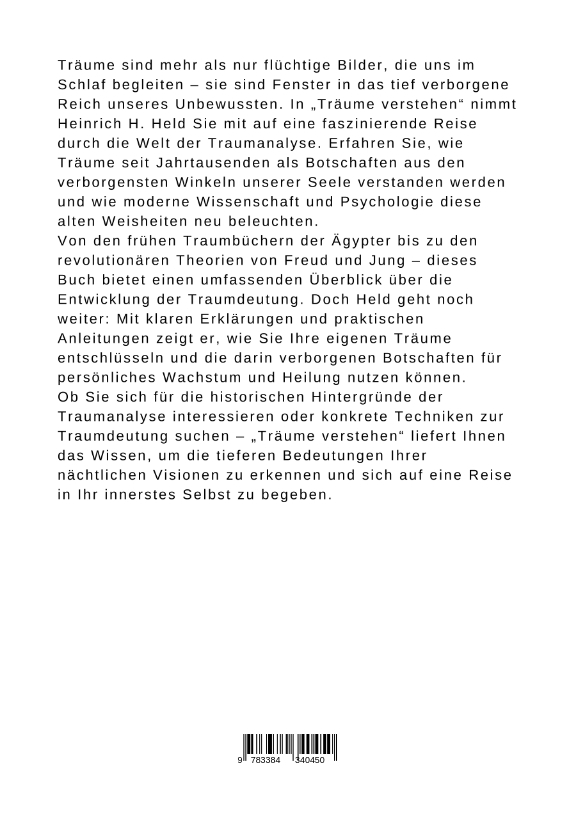 Träume sind mehr als nur flüchtige Bilder, die uns im Schlaf begleiten - sie sind Fenster in das tief verborgene Reich unseres Unbewussten. In "Träume verstehen" nimmt Heinrich H. Held Sie mit auf eine faszinierende Reise durch die Welt der Traumanalyse. Erfahren Sie, wie Träume seit Jahrtausenden als Botschaften aus den verborgensten Winkeln unserer Seele verstanden werden und wie moderne Wissenschaft und Psychologie diese alten Weisheiten neu beleuchten.Von den frühen Traumbüchern der Ägypter bis zu den revolutionären Theorien von Freud und Jung - dieses Buch bietet einen umfassenden Überblick über die Entwicklung der Traumdeutung. Doch Held geht noch weiter: Mit klaren Erklärungen und praktischen Anleitungen zeigt er, wie Sie Ihre eigenen Träume entschlüsseln und die darin verborgenen Botschaften für persönliches Wachstum und Heilung nutzen können.Ob Sie sich für die historischen Hintergründe der Traumanalyse interessieren oder konkrete Techniken zur Traumdeutung suchen - "Träume verstehen" liefert Ihnen das Wissen, um die tieferen Bedeutungen Ihrer nächtlichen Visionen zu erkennen und sich auf eine Reise in Ihr innerstes Selbst zu begeben.
