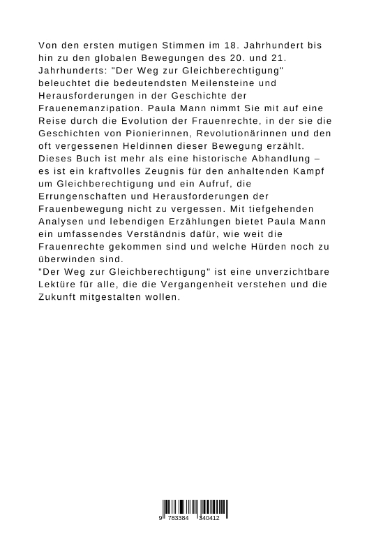Von den ersten mutigen Stimmen im 18. Jahrhundert bis hin zu den globalen Bewegungen des 20. und 21. Jahrhunderts: "Der Weg zur Gleichberechtigung" beleuchtet die bedeutendsten Meilensteine und Herausforderungen in der Geschichte der Frauenemanzipation. Paula Mann nimmt Sie mit auf eine Reise durch die Evolution der Frauenrechte, in der sie die Geschichten von Pionierinnen, Revolutionärinnen und den oft vergessenen Heldinnen dieser Bewegung erzählt.Dieses Buch ist mehr als eine historische Abhandlung - es ist ein kraftvolles Zeugnis für den anhaltenden Kampf um Gleichberechtigung und ein Aufruf, die Errungenschaften und Herausforderungen der Frauenbewegung nicht zu vergessen. Mit tiefgehenden Analysen und lebendigen Erzählungen bietet Paula Mann ein umfassendes Verständnis dafür, wie weit die Frauenrechte gekommen sind und welche Hürden noch zu überwinden sind."Der Weg zur Gleichberechtigung" ist eine unverzichtbare Lektüre für alle, die die Vergangenheit verstehen und die Zukunft mitgestalten wollen.