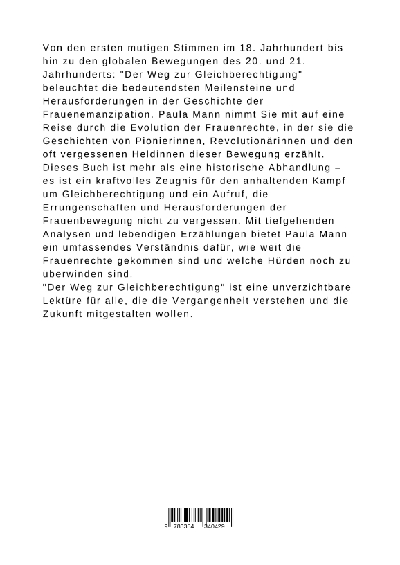 Von den ersten mutigen Stimmen im 18. Jahrhundert bis hin zu den globalen Bewegungen des 20. und 21. Jahrhunderts: "Der Weg zur Gleichberechtigung" beleuchtet die bedeutendsten Meilensteine und Herausforderungen in der Geschichte der Frauenemanzipation. Paula Mann nimmt Sie mit auf eine Reise durch die Evolution der Frauenrechte, in der sie die Geschichten von Pionierinnen, Revolutionärinnen und den oft vergessenen Heldinnen dieser Bewegung erzählt.Dieses Buch ist mehr als eine historische Abhandlung - es ist ein kraftvolles Zeugnis für den anhaltenden Kampf um Gleichberechtigung und ein Aufruf, die Errungenschaften und Herausforderungen der Frauenbewegung nicht zu vergessen. Mit tiefgehenden Analysen und lebendigen Erzählungen bietet Paula Mann ein umfassendes Verständnis dafür, wie weit die Frauenrechte gekommen sind und welche Hürden noch zu überwinden sind."Der Weg zur Gleichberechtigung" ist eine unverzichtbare Lektüre für alle, die die Vergangenheit verstehen und die Zukunft mitgestalten wollen.