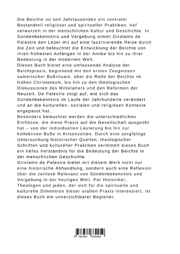 Die Beichte ist seit Jahrtausenden ein zentraler Bestandteil religiöser und spiritueller Praktiken, tief verwurzelt in der menschlichen Kultur und Geschichte. In Sündenbekenntnis und Vergebung nimmt Girolamo de Palestre den Leser mit auf eine faszinierende Reise durch die Zeit und beleuchtet die Entwicklung der Beichte von ihren frühesten Anfängen in der Antike bis hin zu ihrer Bedeutung in der modernen Welt.Dieses Buch bietet eine umfassende Analyse der Beichtpraxis, beginnend mit den ersten Zeugnissen sumerischer Bußrituale, über die Rolle der Beichte im frühen Christentum, bis hin zu den theologischen Diskussionen des Mittelalters und den Reformen der Neuzeit. De Palestre zeigt auf, wie sich das Sündenbekenntnis im Laufe der Jahrhunderte verändert und an die kulturellen, sozialen und religiösen Kontexte angepasst hat.Besonders beleuchtet werden die unterschiedlichen Einflüsse, die diese Praxis auf die Gesellschaft ausgeübt hat - von der individuellen Läuterung bis hin zur kollektiven Buße in Krisenzeiten. Durch eine sorgfältige Untersuchung historischer Quellen, theologischer Schriften und kultureller Praktiken vermittelt dieses Buch ein tiefes Verständnis für die Bedeutung der Beichte in der menschlichen Geschichte.Girolamo de Palestre bietet mit diesem Werk nicht nur eine historische Abhandlung, sondern auch eine Reflexion über die zeitlose Relevanz von Sündenbekenntnis und Vergebung in der heutigen Welt. Für Historiker, Theologen und jeden, der sich für die spirituelle und kulturelle Dimension dieser uralten Praxis interessiert, ist dieses Buch ein unverzichtbarer Begleiter.