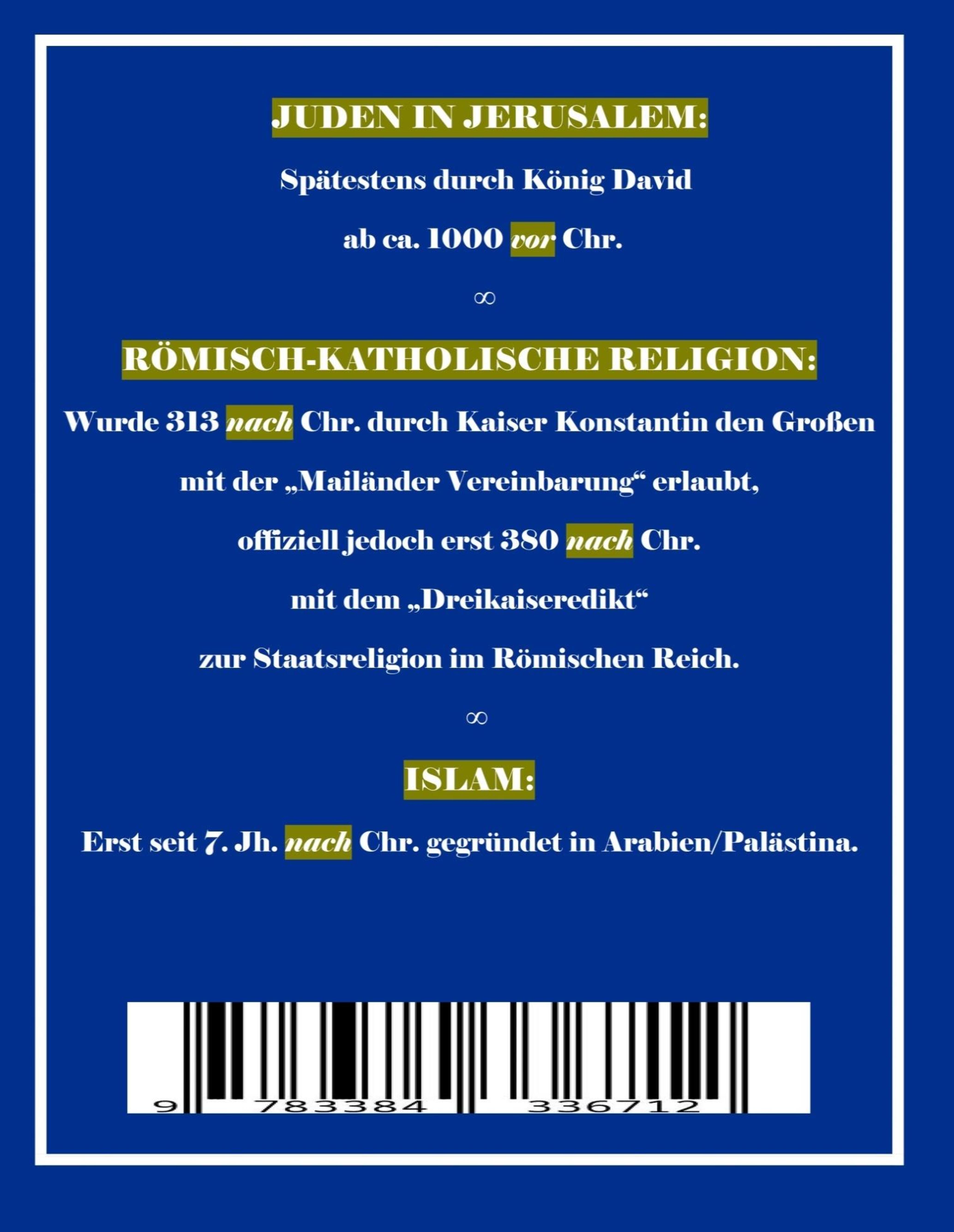 Anlässlich des grausamen Überfalls durch die palästinensische Organisation HAMAS auf den Staat Israel am 7. Oktober 2023: Die muslimische Religion des Islam, der KORAN, befiehlt die Vernichtung Andersgläubiger: Juden und Christen! In den muslimischen Völkern/Ländern gibt es keine Trennung von Staat und Kirche/ Religion, wie bei uns seit der Weimarer Reichsverfassung von 1919, Art. 137. Der Koran ist das Grundgesetz des Muslims. DIE FREIHEIT UND DIE WAHRHEIT, DIE JESUS MEINTE - Vorwort von Marguerite KolloPersönliche Erlebnisse und auch Freundschaften, gerade in der Zeit der Judenverfolgung in den 1920-30er Jahren, hatten meinen Vater dazu bewogen, über das jüdische Volk und die religiöse Herkunft des Judentums zu recherchieren und zu schreiben. ...Wegen des heute besonderen Desinteresses der westlichen Welt in Glaubensfragen und der Fragwürdigkeit kirchlicher Institutionen, habe ich diese Thematik, unter Einbezug der im Archiv gefundenen Ausführungen meines Vaters, in der vorliegenden Form, nach ausführlicher Recherche, erweitert und zusammengestellt. Ich wurde evangelisch erzogen und habe inzwischen mein 89. Lebensjahr vollendet. Religion hat mich immer sehr berührt und interessiert. Und als Kind einer Theaterfamilie hat mich die "Große Inszenierung" und die Schönheit der Kircheneinrichtungen bis heute begeistert. Aber ich gehöre aus Überzeugung keiner Konfession an, weil ich zutiefst an eine uns lenkende Kraft, die man auch Gott nennen darf, glaube und danach lebe. Ich hoffe, dass das aus dem Inhalt des hier vorliegenden Buches hervorgeht. Ich empfinde die von Jesus gepredigte Freiheit aller Menschen so, dass ich frei bin, zu glauben, was oder wie ich es will. Und dass damit nicht die heute so viel gelobte Liberalität, die Freiheit des geistlosen Tuns, gemeint sein kann, sondern eine Verpflichtung zur gelebten und vermittelten Freiheit durch Verstand, Vernunft und Wahrheit. Bei diesem Buch handelt es sich um den lebendigen Juden Jesus von Nazareth bis zu seiner Kreuzigung, der in Jerusalem in einer Zeit gelebt hat, die nicht anders war, als es heute in allen politischen Machtzentren der Fall ist. Es geht hier um Gott - und die Machtpolitik der Menschen, wie auch um die Tatsache, dass den Menschen ihre Schuld durch Gott eigentlich nicht so einfach zu vergeben sein kann. Da nützen auch keine Beichten und Ablässe vor dem angeblich von Gott beauftragten Bodenpersonal. Wer dem glaubt, wird eben nicht selig und dadurch auch nicht ohne Schuld. Wenn das so leicht wäre, müsste man, nach unserem heutigen Verständnis, an der Allmacht Gottes zweifeln. Wenn man aber, wie ich es fühle und tue, und das auf der Basis der 10 Gebote bzw. des Grundgesetzes, an Gott bzw. an eine nicht nennbare oder sichtbare Kraft glaubt, die uns lenkt, dann braucht man keine angeblich von Gott beauftragten Menschen, die fast immer nur an ihre eigene mehr oder weniger ausgeprägte Macht glauben und allein nur dafür kämpfen. Und das war schon zur Lebenszeit Jesu leider nicht anders. Diese Trilogie beinhaltet das Leben des lebendigen Jesus bis zu seiner Kreuzigung, eine Lese-Tragödie aus dem mittelalterlichen Christentum und eine Satire über den Nihilismus, der behauptet, dass es keinen Gott gäbe. Sehr geehrte Leserin, sehr geehrter Leser, ich wünsche Ihnen, auch im Namen meines Vaters Willi Kollo (p.m.), unterhaltende und vor allem für Ihr weiteres Leben an Erkenntnis reiche Stunden. - Ihre Marguerite Kollo - 20. Juli 2024