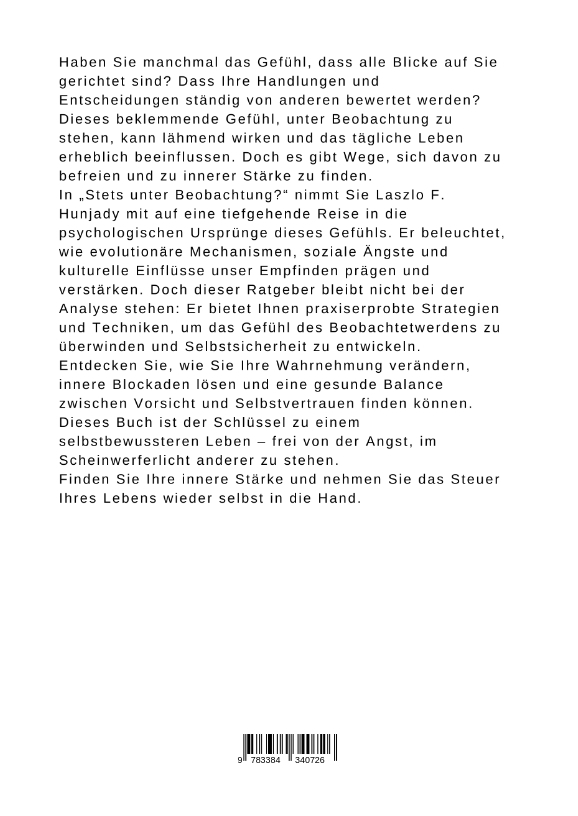 Haben Sie manchmal das Gefühl, dass alle Blicke auf Sie gerichtet sind? Dass Ihre Handlungen und Entscheidungen ständig von anderen bewertet werden? Dieses beklemmende Gefühl, unter Beobachtung zu stehen, kann lähmend wirken und das tägliche Leben erheblich beeinflussen. Doch es gibt Wege, sich davon zu befreien und zu innerer Stärke zu finden.In "Stets unter Beobachtung?" nimmt Sie Laszlo F. Hunjady mit auf eine tiefgehende Reise in die psychologischen Ursprünge dieses Gefühls. Er beleuchtet, wie evolutionäre Mechanismen, soziale Ängste und kulturelle Einflüsse unser Empfinden prägen und verstärken. Doch dieser Ratgeber bleibt nicht bei der Analyse stehen: Er bietet Ihnen praxiserprobte Strategien und Techniken, um das Gefühl des Beobachtetwerdens zu überwinden und Selbstsicherheit zu entwickeln.Entdecken Sie, wie Sie Ihre Wahrnehmung verändern, innere Blockaden lösen und eine gesunde Balance zwischen Vorsicht und Selbstvertrauen finden können. Dieses Buch ist der Schlüssel zu einem selbstbewussteren Leben - frei von der Angst, im Scheinwerferlicht anderer zu stehen.Finden Sie Ihre innere Stärke und nehmen Sie das Steuer Ihres Lebens wieder selbst in die Hand.