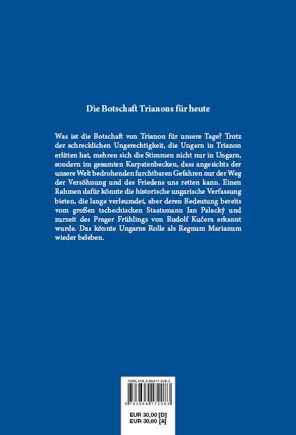 Was ist die Botschaft von Trianon fur unsere Tage? Trotz der schrecklichen Ungerechtigkeit, die Ungarn in Trianon erlitten hat, mehren sich die Stimmen nicht nur in Ungarn, sondern im gesamten Karpatenbecken, dass angesichts der unsere Welt bedrohenden furchtbaren Gefahren nur der Weg der Versohnung und des Friedens uns retten kann. Einen Rahmen dafur konnte die historische ungarische Verfassung bieten, die lange verleumdet, aber deren Bedeutung bereits vom grosen tschechischen Staatsmann Jan Palackŷ und zurzeit des Prager Fruhlings von Rudolf Kučera erkannt wurde. Das konnte Ungarns Rolle als Regnum Marianum wieder beleben.