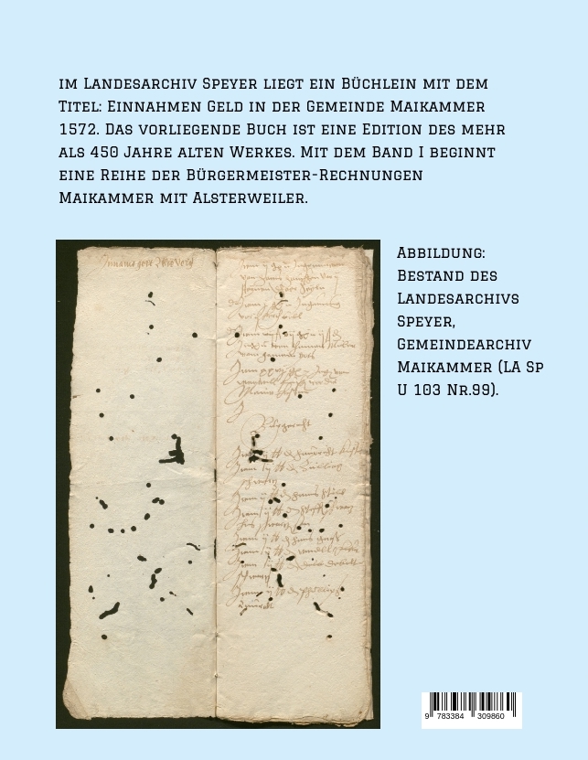 Das Buch enthält die Edition der Einnahmenrechnung aus dem Jahre 1572 für die Gemeinde Maikammer mit Alsterweiler. Neben der Übertragung werden die Familiennamen und die Inhalte der Einungen erläutert.