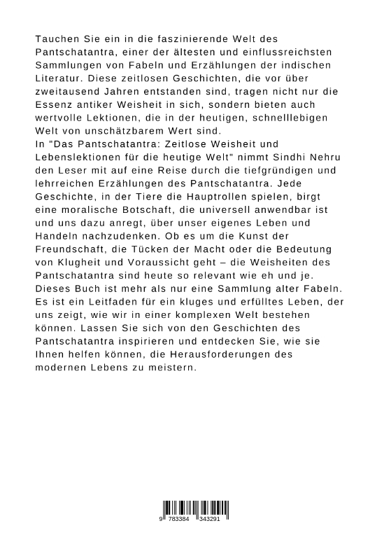 Tauchen Sie ein in die faszinierende Welt des Pantschatantra, einer der ältesten und einflussreichsten Sammlungen von Fabeln und Erzählungen der indischen Literatur. Diese zeitlosen Geschichten, die vor über zweitausend Jahren entstanden sind, tragen nicht nur die Essenz antiker Weisheit in sich, sondern bieten auch wertvolle Lektionen, die in der heutigen, schnelllebigen Welt von unschätzbarem Wert sind.In "Das Pantschatantra: Zeitlose Weisheit und Lebenslektionen für die heutige Welt" nimmt Sindhi Nehru den Leser mit auf eine Reise durch die tiefgründigen und lehrreichen Erzählungen des Pantschatantra. Jede Geschichte, in der Tiere die Hauptrollen spielen, birgt eine moralische Botschaft, die universell anwendbar ist und uns dazu anregt, über unser eigenes Leben und Handeln nachzudenken. Ob es um die Kunst der Freundschaft, die Tücken der Macht oder die Bedeutung von Klugheit und Voraussicht geht - die Weisheiten des Pantschatantra sind heute so relevant wie eh und je.Dieses Buch ist mehr als nur eine Sammlung alter Fabeln. Es ist ein Leitfaden für ein kluges und erfülltes Leben, der uns zeigt, wie wir in einer komplexen Welt bestehen können. Lassen Sie sich von den Geschichten des Pantschatantra inspirieren und entdecken Sie, wie sie Ihnen helfen können, die Herausforderungen des modernen Lebens zu meistern.
